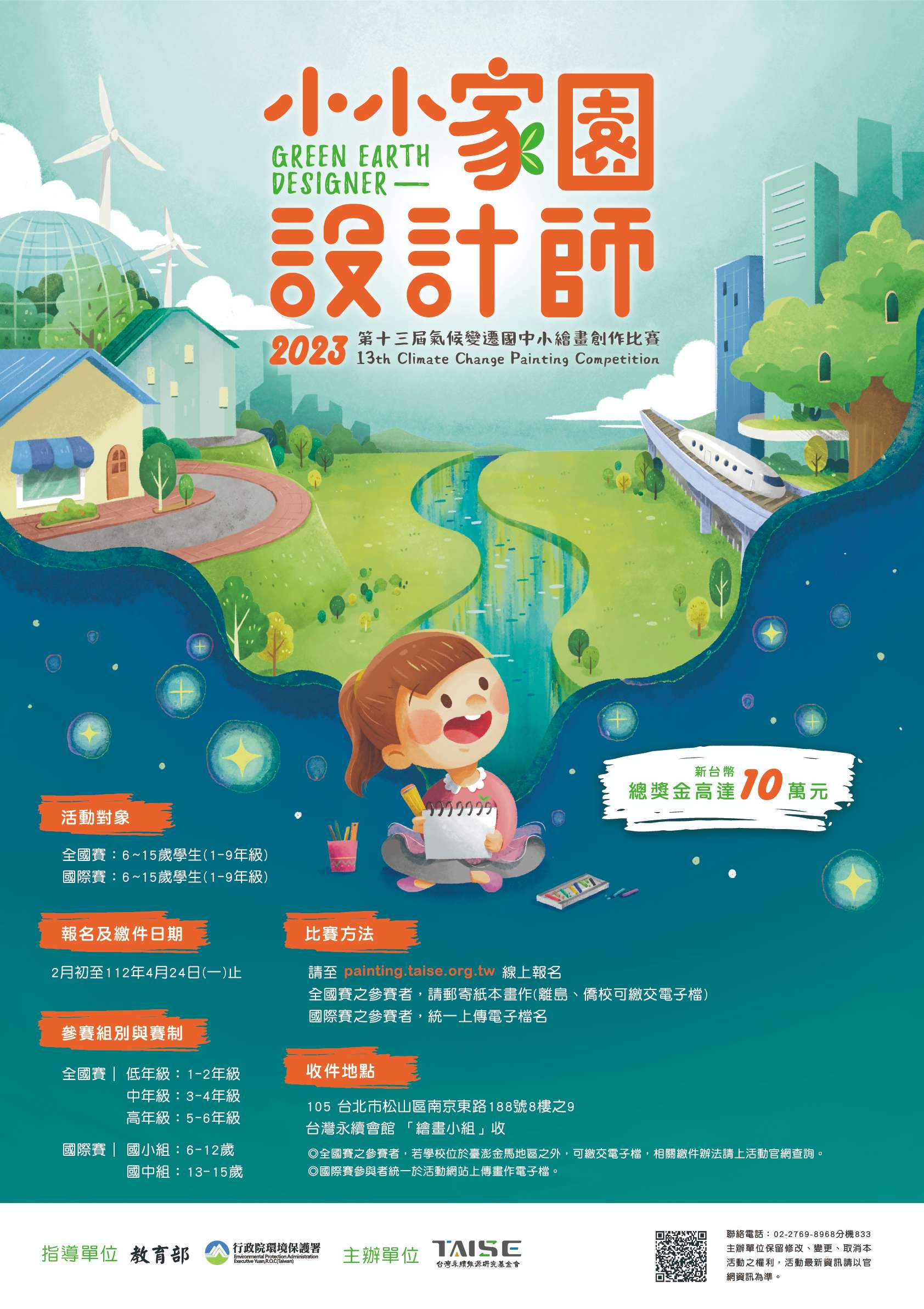 一、由教育部、行政院環境保護署指導,本會主辦之「氣候變遷國中小繪畫創作比賽」迄今已舉辦12屆,累計40國、 59,152名學子參與。本屆(第13屆)為呼應聯合國永續發展目標(SDGs)的第11項,以「小小家園設計師」為主題,提升國中小師生關注天然災害對城市造成的損傷,思考如何 降低城市垃圾和空氣污染,同時重視社區文化與自然遺產等。此繪畫比賽也呼應第13項,採取氣候行動並提升大眾相關意識。