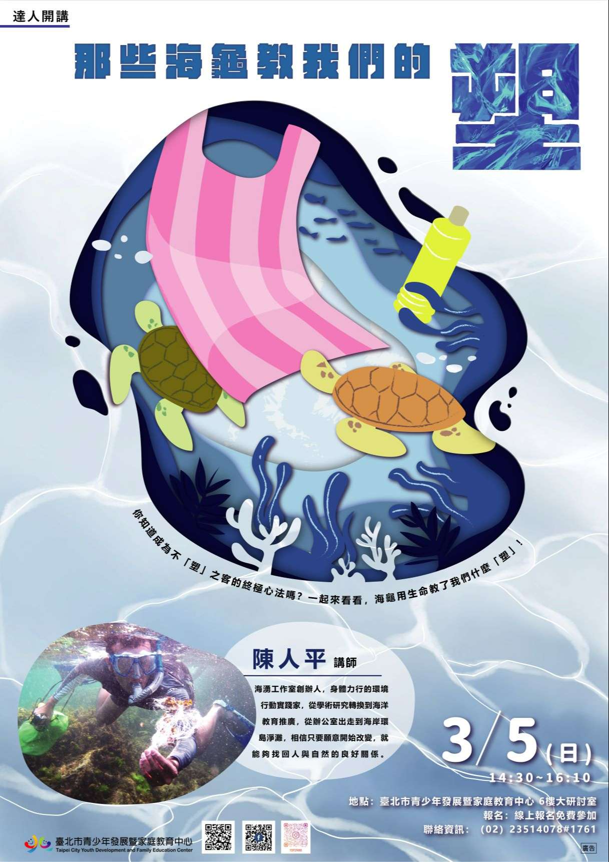 臺北市青少年發展暨家庭教育中心心於112年3月5日(星期日)下午2時30分舉辦達人開講系列之免費講座:「那些海龜教我們的塑」,鼓勵學生踴躍報名參加。