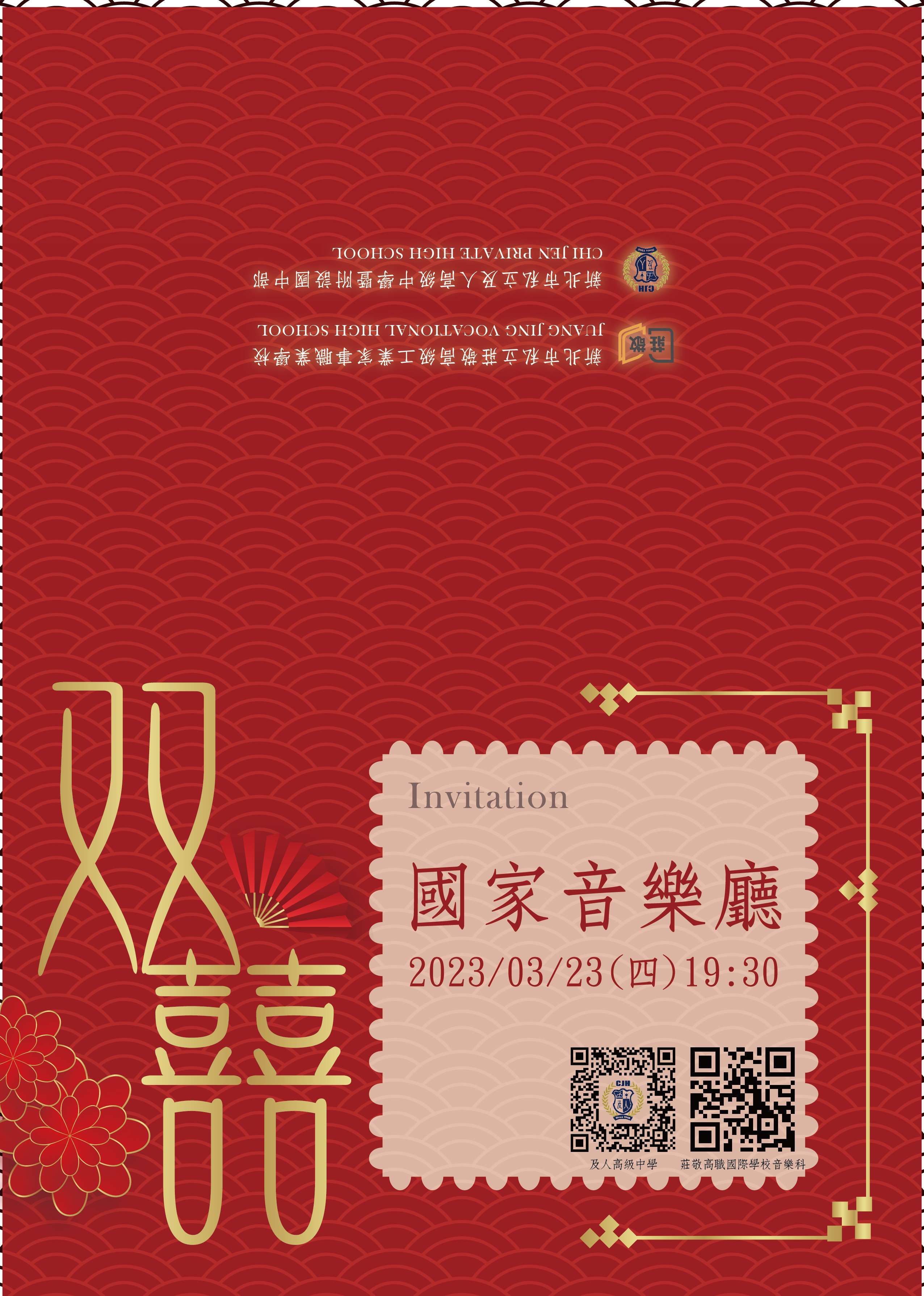 新北市私立及人高級中學擊樂團,訂於112年3月23日(星期四)於國家音樂廳舉辦「双囍」音樂會,檢送活動海報及邀請函電子檔,敬請惠予公告。