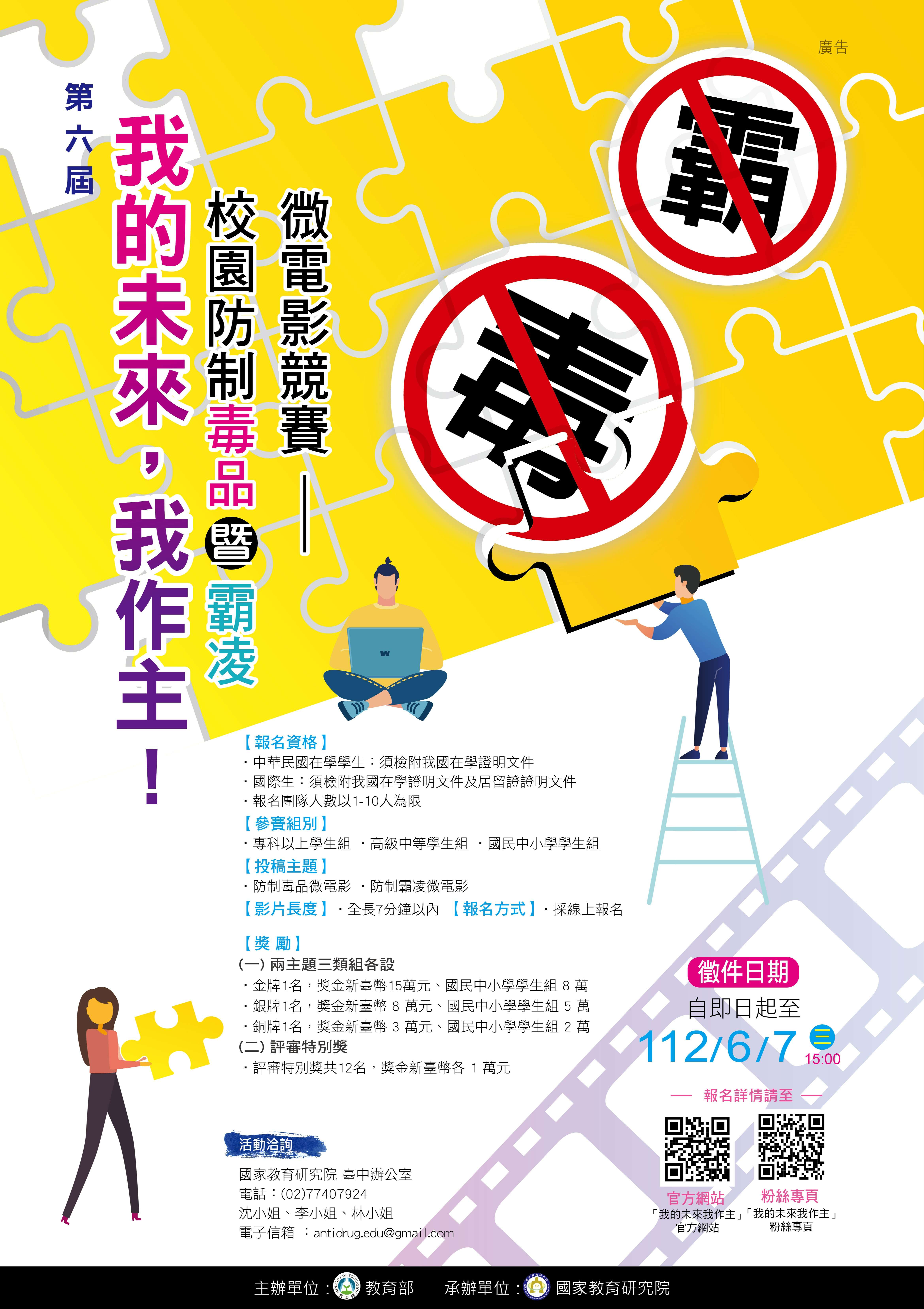 五、詳細競賽資訊請至「我的未來我作主」官方網站 以及「我的未來我作主-微電影競賽臉書粉絲專頁」查詢,或洽詢承辦單位,電話:02-77407924。