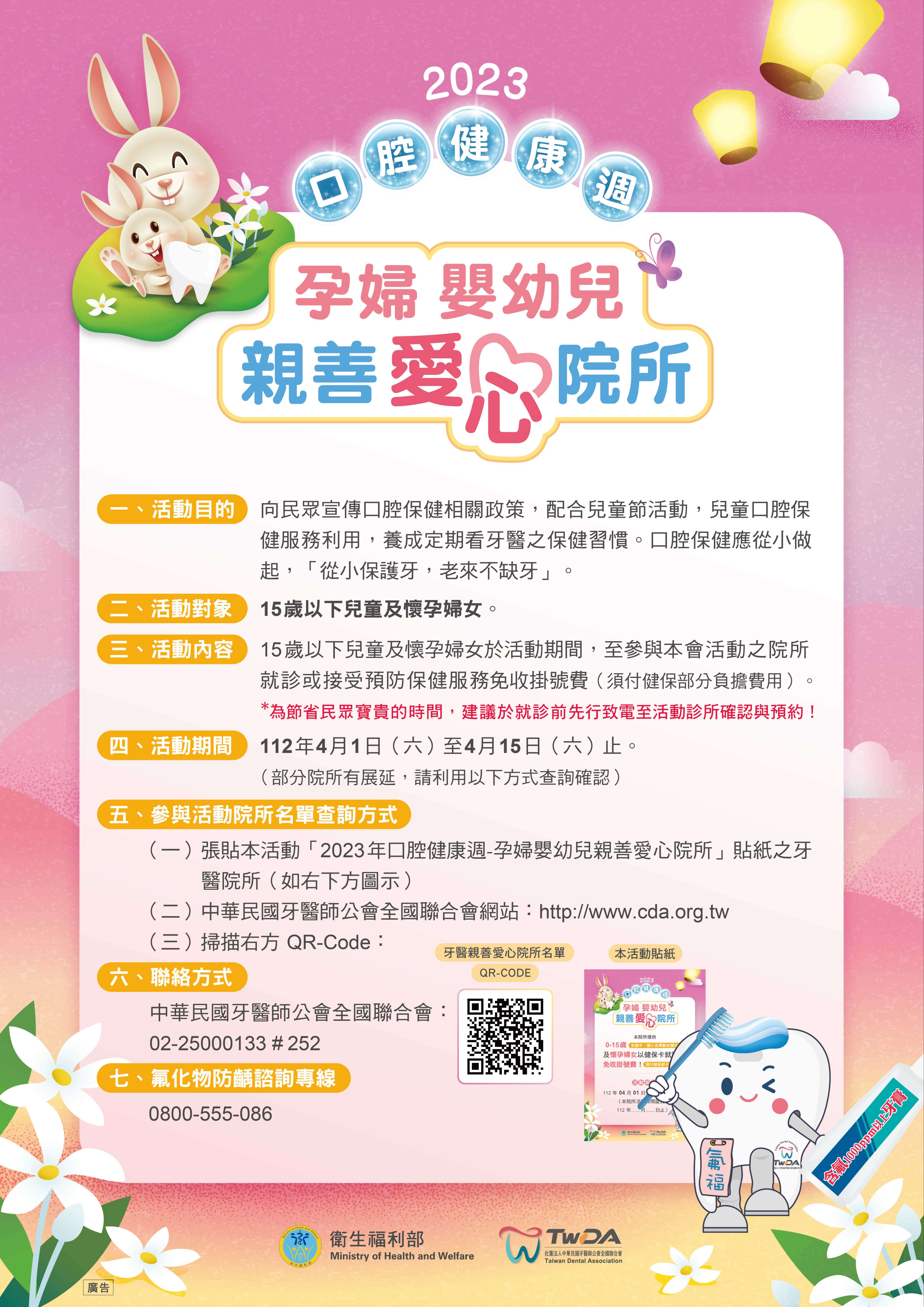 轉知牙醫師公會全國聯合會辦理2023年「孕婦嬰幼兒親善愛心院所」活動訊息,詳如說明,請查照。