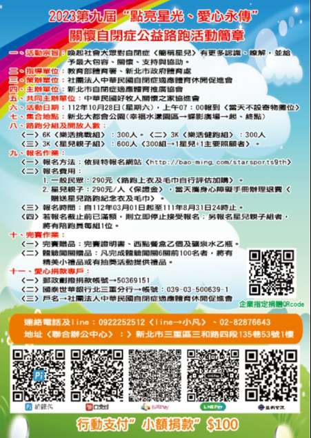 三、然為讓星兒家庭們能走到戶外與一般民眾享有同樣的體育休閒生活,遂策劃辦理此項關懷自閉症公益路跑活動,相關內容如下:
