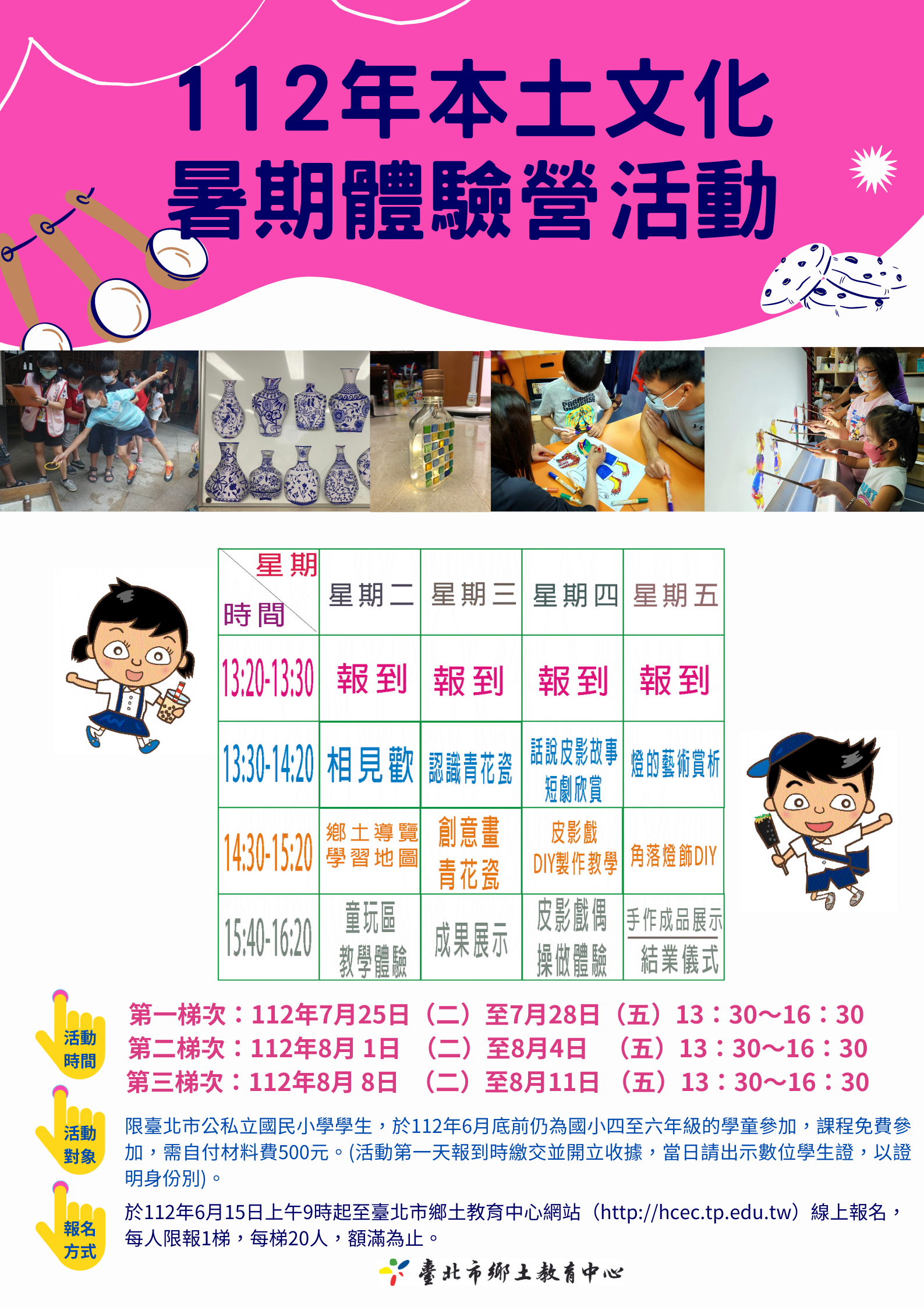 (二)報名時間:於112年6月15日上午9時起至臺北市鄉土教育中心網站(網頁連結)線上報名,每人限報1梯,每梯20人,額滿為止。課程免費參加,需自付材料費500元。