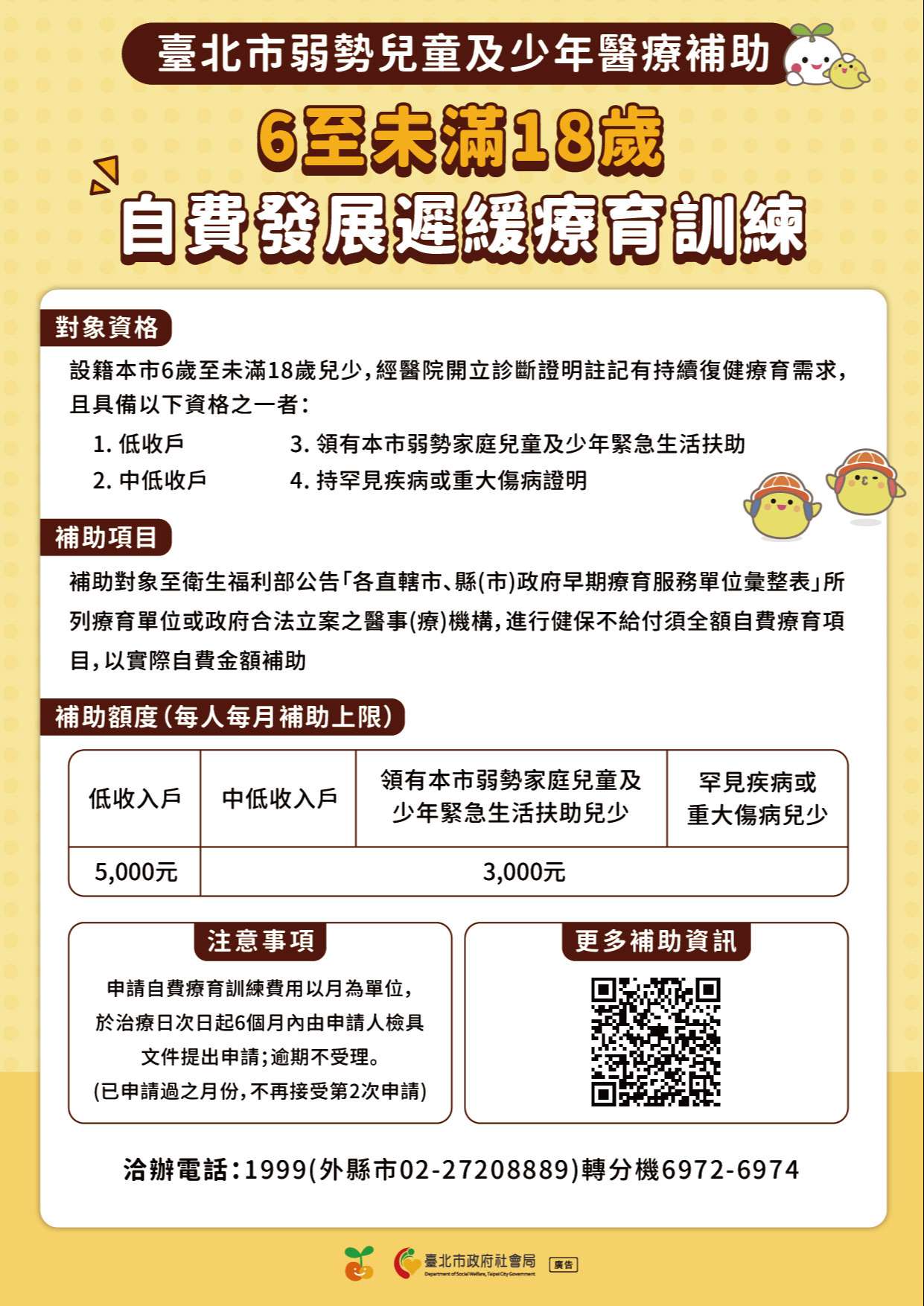 三、檢附旨揭補助申請宣傳DM如附件,申請表件與說明資料請至本府社會局網站(網址)首頁/兒童與少年服務/生活經濟扶(補)助/臺北市弱勢兒童及少年醫療補助下載;如有疑問請致電02- 27208889/1999轉6972-4。
