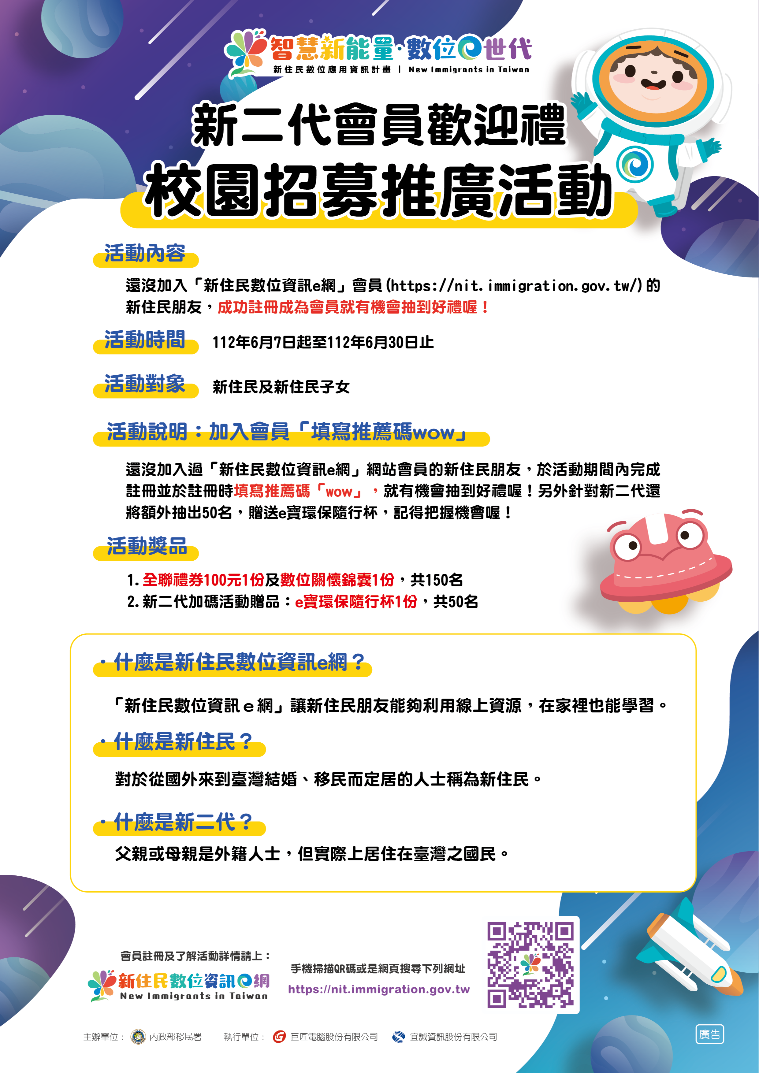 三、為廣邀校園之新住民及新住民子女踴躍參與學習,該署特舉辦「新二代會員歡迎禮~園招募推廣活動」新會員註冊推廣活動,活動期間自112年6月7日至112年6月30日止,活動詳情請參閱新住民數位資訊e網公布欄。