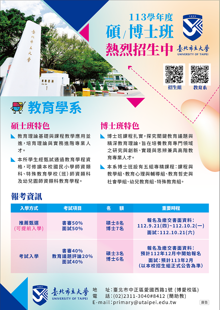 一、本校為全臺第一所高等教育學府,教育學系承接師資培育與學術研究百年基業。碩士班招生8名;博士班設有五組專精課程:課程與教學組、教育哲史與社會學組、教育心理與輔導組、幼兒教育組與特殊教育組,合計招生7名。