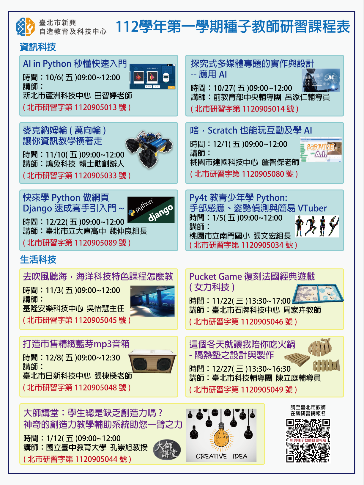 (一)「AI in Python秒懂快速入門」:112年10月6日(五) 上午9時至12時,共計3小時,講師:新北市蘆洲科技中心田智婷老師