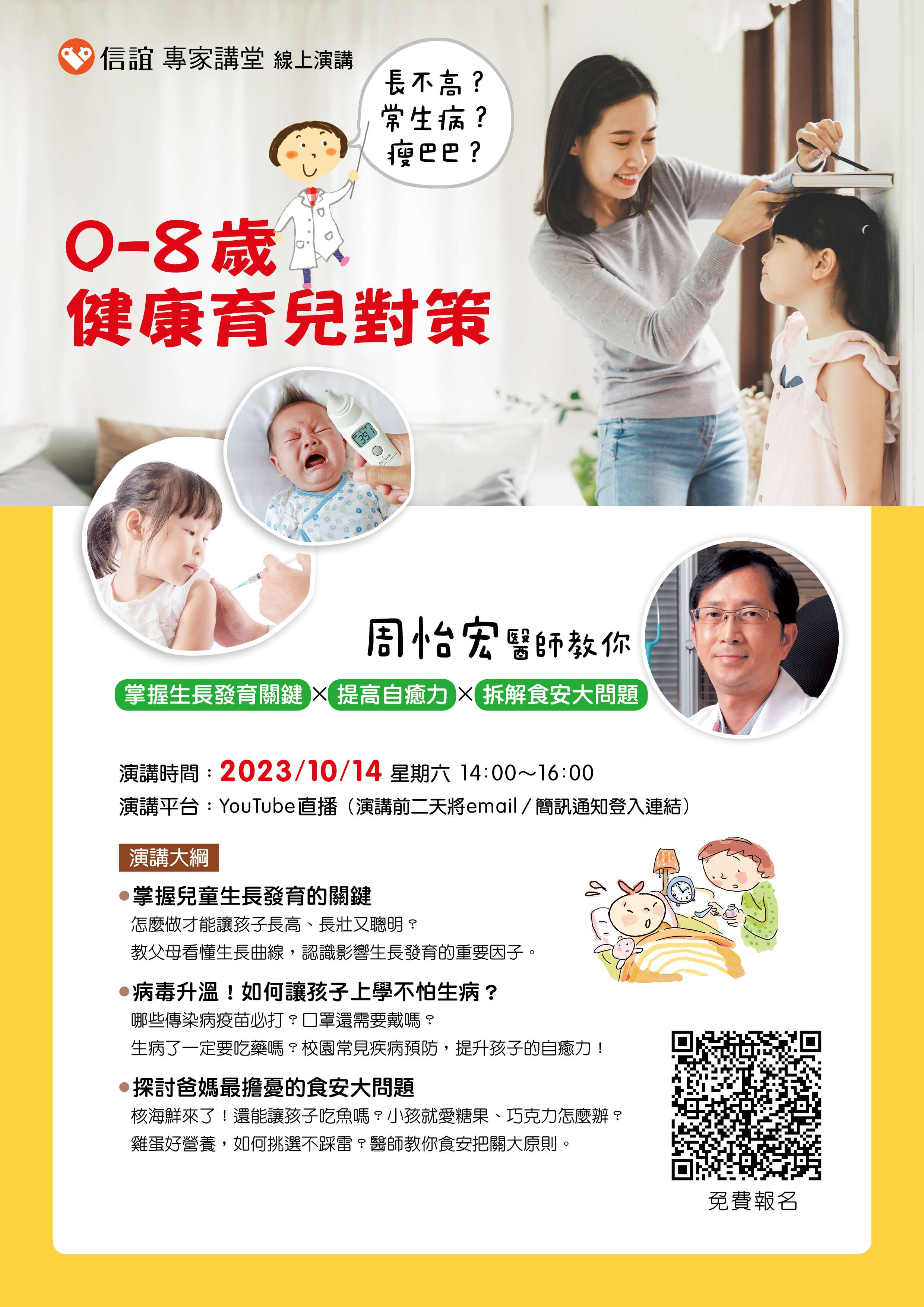 一、孩子平安與健康是父母與老師的最大心願。但是,孩子入學後經常生病,我們該如何預防並提高自癒力?秋冬正值各種病毒蔓延,【信誼專家講堂】特別邀請小兒醫學專家~ 周怡宏醫師進行專題演講,周醫師將以30年的醫學知識與臨床經驗,傳授父母健康育兒的對策。