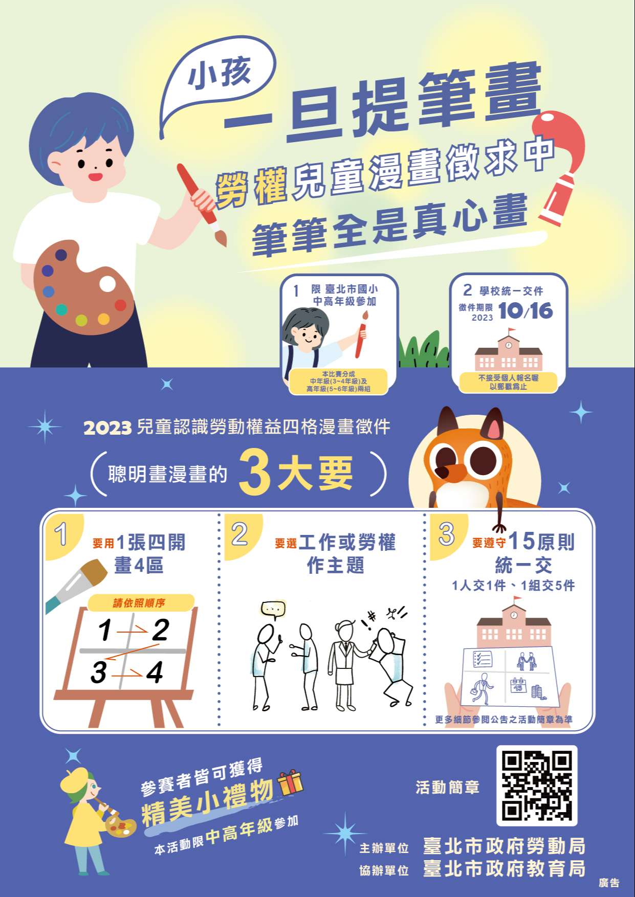 一、為推廣校園勞動教育再向下扎根,以本市國民小學中、高年級學生為對象,辦理「2023年兒童認識勞動權益四格漫畫徵件競賽活動」,期藉由競賽式活動設計,鼓勵教師將勞動教育融入繪畫教學,並指導學生參加四格漫畫創作,進而啟發學生對勞動尊嚴及職場環境之認知與關心,以提升未來公民勞動素養。