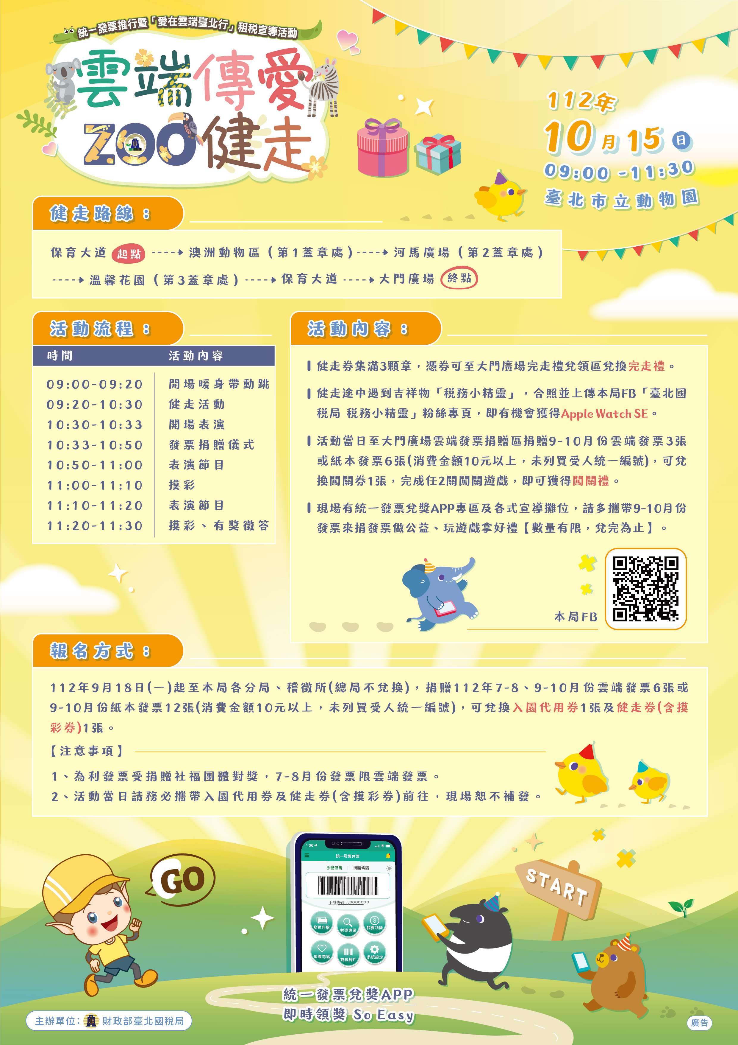 為推廣雲端發票、統一發票兌獎APP及最新稅制稅政暨便民措施,財政部臺北國稅局於112年10月15日(星期日)假臺北市立動物園舉辦「雲端傳愛 ZOO健走」租稅宣導活動。