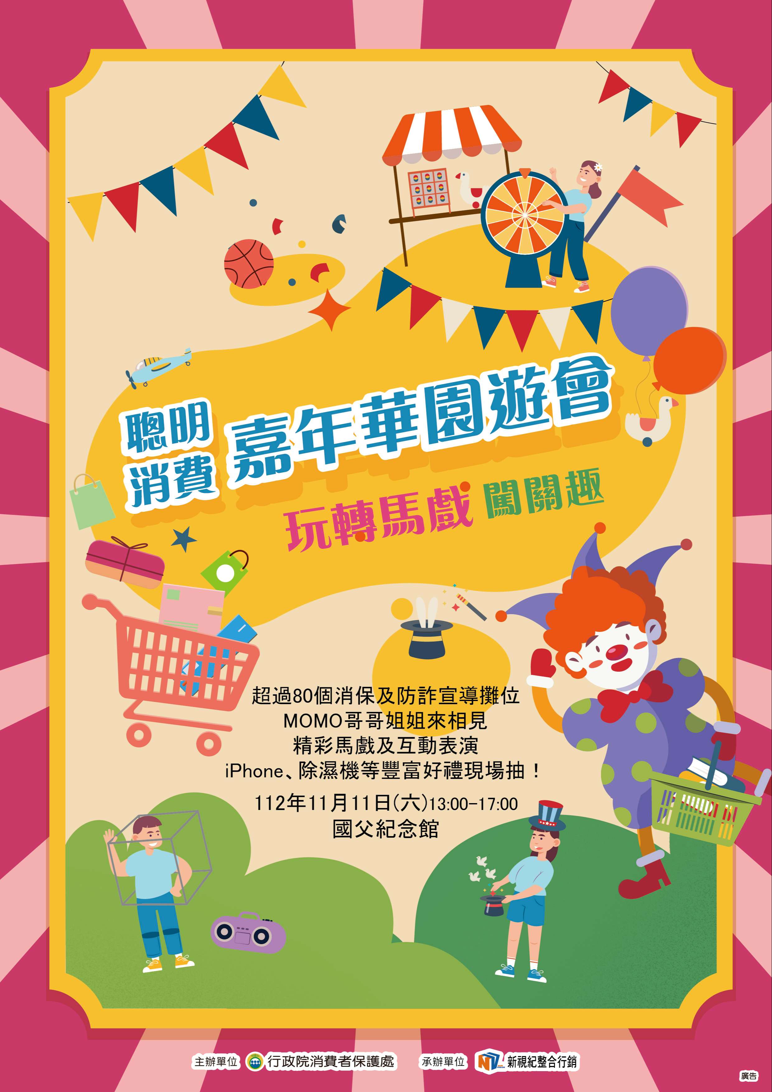 112年11月11日下午1時至5時,歡迎前往國父紀念館參加聰明消費嘉年華園遊會,闖關抽大獎。