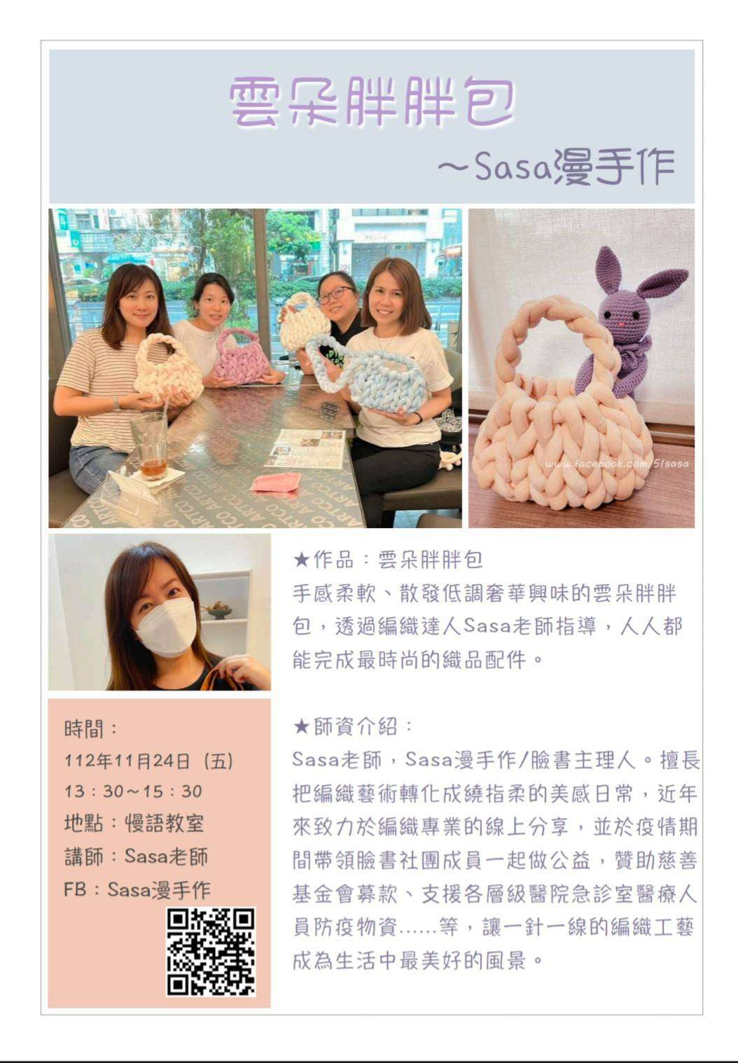 手感柔軟、散發低調奢華興味的雲朵胖胖包,透過編織達人Sasa老師指導,人人都能完成最時尚的織品配件。