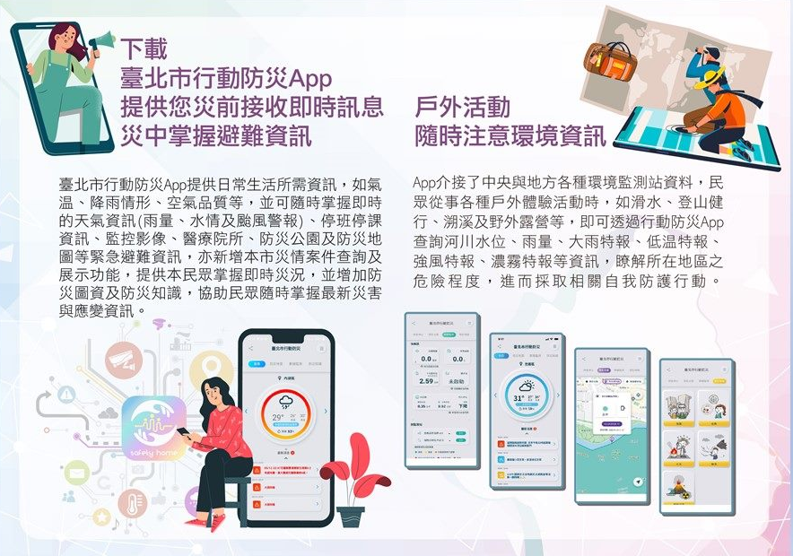 臺北市行動防災App可掌握即時的天氣資訊(雨量、水情及颱風警報)、停班停課資訊、監控影像、醫療院所、防災公園及防災地圖等緊急避難資訊,亦新增本市災情案件查詢及展示功能,提供民眾掌握即時災況。