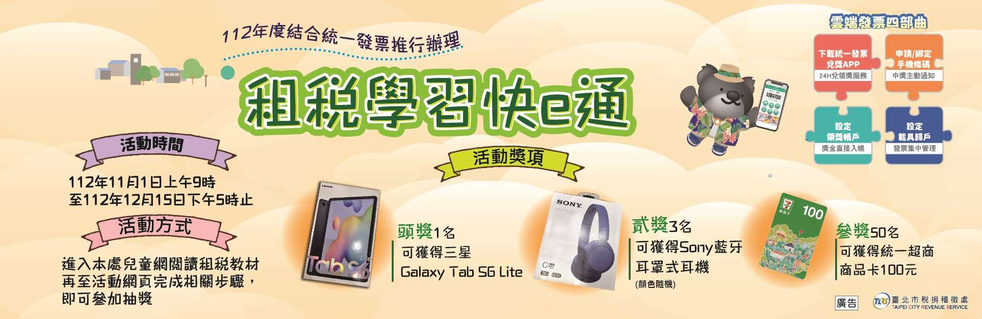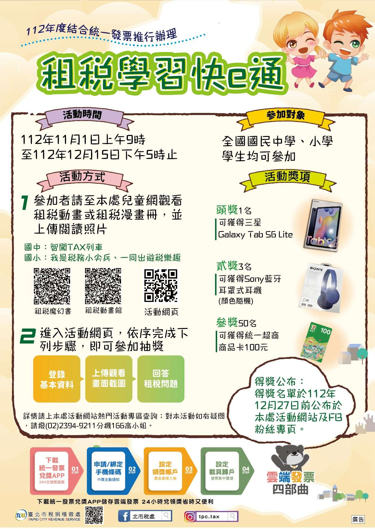 (二)活動內容:國中、國小學生於活動期間至「臺北市稅捐稽徵處兒童網」觀看租稅教育動畫或漫畫,將閱讀情形拍照上傳活動網頁,並正確回答租稅問題,就有機會獲三星Galaxy TabS6 Lite、Sony藍牙耳罩式耳機及統一超商 商卡100元等多項好禮!