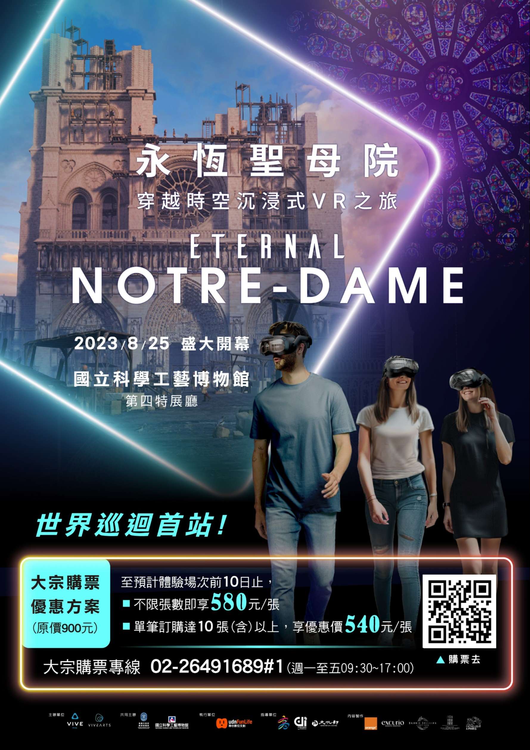 一、法國指標性的哥德式建築,同時也是寶貴的文化藝術資產「巴黎聖母院」於2019年4月慘遭祝融,重建計畫受到全球矚目及支持,除了建築本身的修建外,法國電信商Orange與天主教巴黎總教區、巴黎市政府合作打造以融合VR科技的沉浸式體驗《永恆聖母院》來重現巴黎聖母院的歷史與藝術價值,也被視為科技復興世界文化遺產的重要里程碑。如此別具歷史意義的VR體驗在HTC、VIVE Arts策畫、本公司執行的共同合作下,引進台灣作為海外巡迴首站。《永恆聖母院》是一趟穿越時空的沉浸式數位旅行,觀眾來到《永恆聖母院》的展覽現場,建立一個虛擬分身之後,僅須配戴VR頭顯裝置及背包,就可以在虛擬導遊的引領下,飛越國界直達法國,重回十二世紀巴黎聖母院開始建造的最初時刻。深入建築內部,以360度全方位近距離觀賞末日審判之門、祭壇、拱頂、玫瑰花窗、管風琴等精湛絕美的建築元素;最後跟著升降梯登上69公尺高的鐘塔,在巨鐘的底下感受多具銅鐘齊響的震撼。還能走出塔樓到戶外,以絕佳的視野俯瞰瞭望大文豪雨果筆下的巴黎世界,並重回2019年燒毀前屋頂尖塔的火災現場,向世人展示正如火如荼進行中的修復計畫。全長共45分鐘的VR走動式體驗,《永恆聖母院》將提供學生們一個既有趣又教育性的嶄新體驗,有助於拓寬國際藝文視野及對於元宇宙、虛擬實境科技的認識。