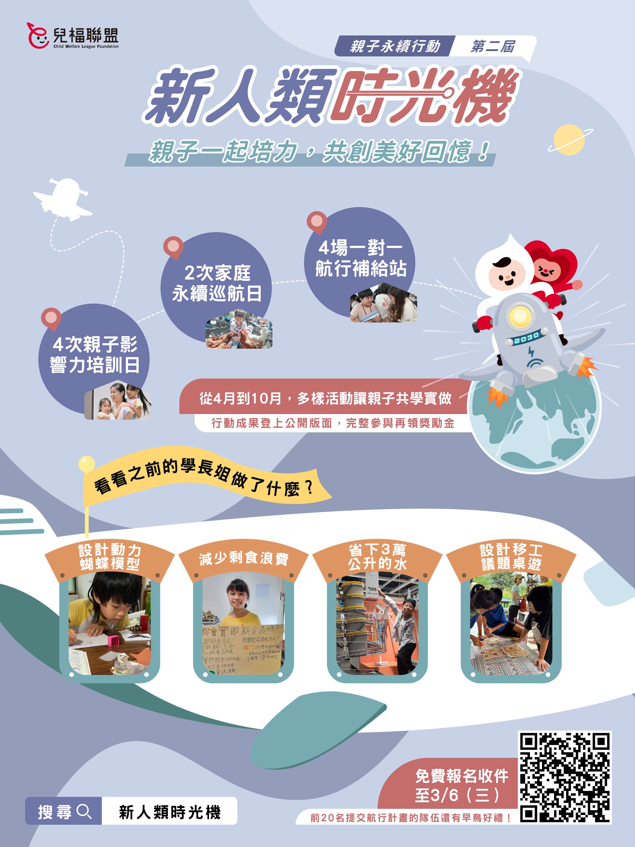 《新人類時光機》是以家庭為單位的永續行動培力計畫,我們希望透過親子共學培養孩子的觀察、同理能力,並讓親子在過程中一同練習關懷世界,接觸更多元的永續發展 (Sustainable Development)議題,建立孩子的國際視野並培養孩子的素養與問題解決能力,預計本屆將選出10至15組隊伍,透過專業師資帶領的設計思考共學工作坊、多元的戶外參訪體驗活動、一對一的永續行動方案指導會議 等等,激發孩子系統思考、解決問題以及規劃執行的能力,發想創新永續行動方案,來解決觀察到的問題困境。 參與本次計畫不需要繳交任何費用,但須確保能參與所有計畫的課程內容,計畫期間僅能請假1次,自1月2日(二) 起開放線上填寫報名表申請,截止日期為3月6日(三), 報名申請網站,我們也將提供A1尺寸紙本海報一張預計於1月12日左右寄達,懇請貴單位協助張貼宣傳。