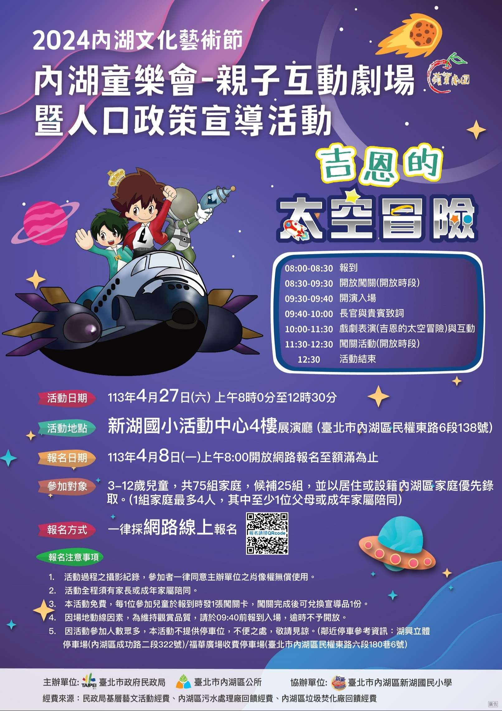 二、刊登宣導訊息如下:臺北市內湖區公所於4月27日(六) 8時0分至12時30分,於臺北市內湖區新湖國民小學活動中心舉辦2024年內湖文化藝術節「內湖童樂會-親子互動劇場」暨人口政策宣導活動,當日邀請知名蘋果劇團表演「吉恩的太空冒險」,現場還有4種各具特色的童玩闖關遊戲,歡迎爸爸媽媽們帶寶貝「一起童樂」,113年4月8日上午8時起開放網路報名,額滿為止,名額有限,詳情請參閱內湖區公所網站。