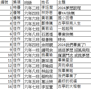 恭喜以下同學參加<古亭國小第70屆畢業紀念設美術設計比賽>獲獎