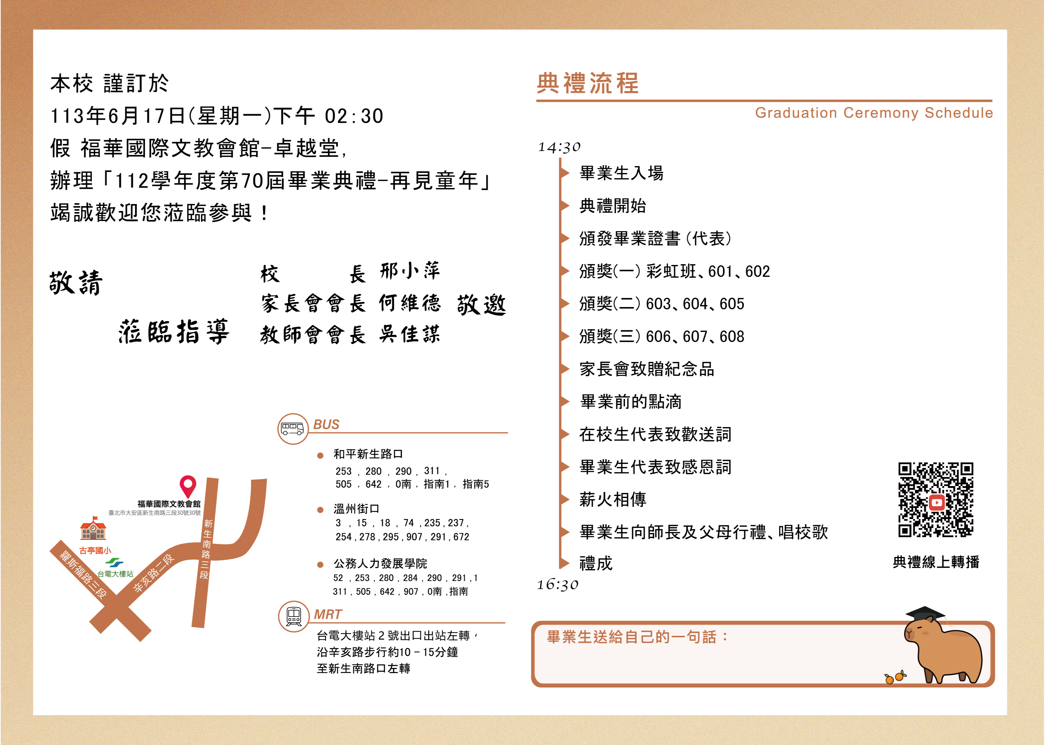 113年6月17日〈星期一〉下午2:30,我們將在鄰近的福華文教會館卓越堂舉辦「112學年度第70屆畢業典禮~再見童年」,