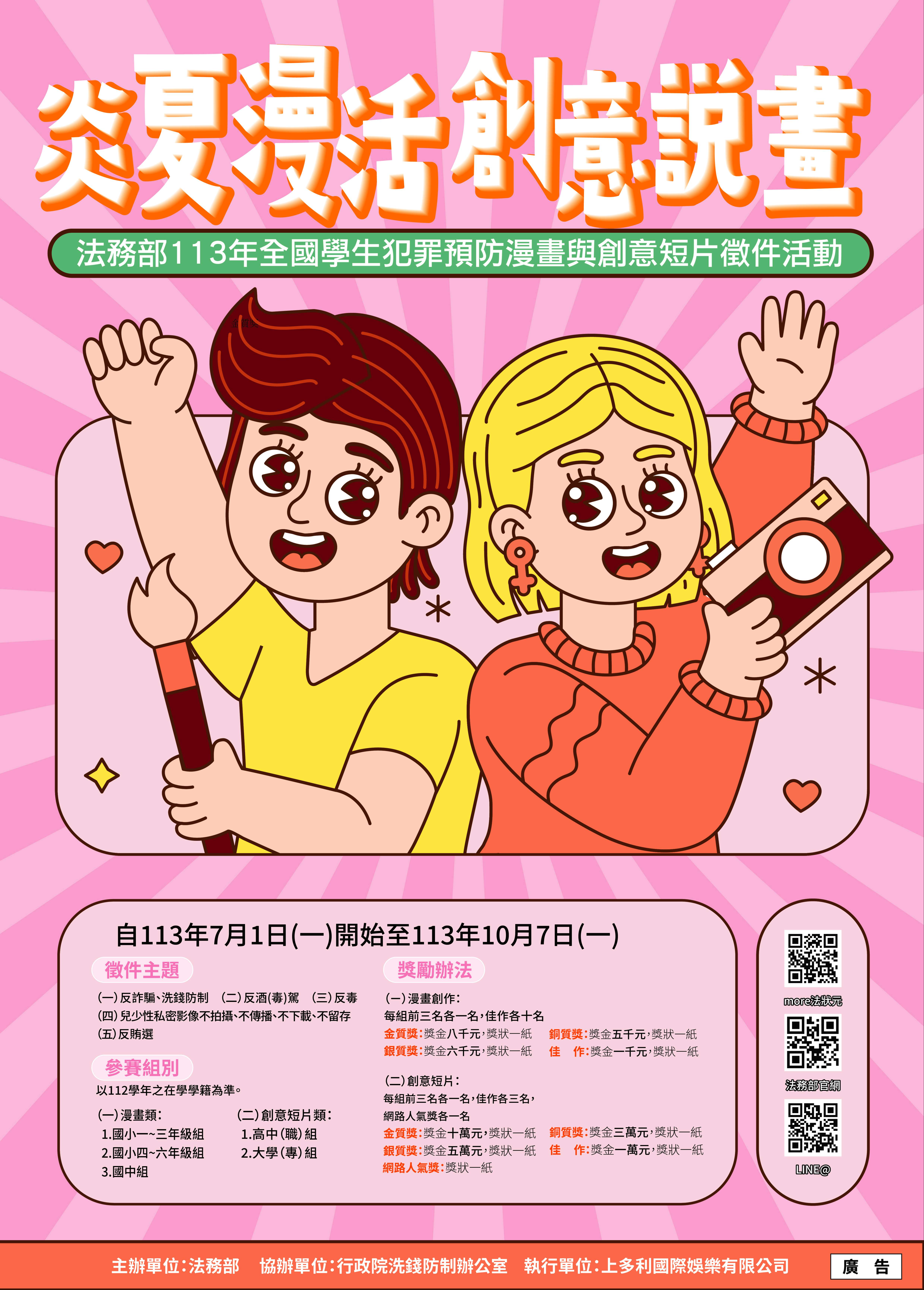 113年全國學生犯罪預防漫畫與創意短片徵件活動辦法、報名表、海報等各乙份,請各校鼓勵學生及員工子女,踴躍報名參加。