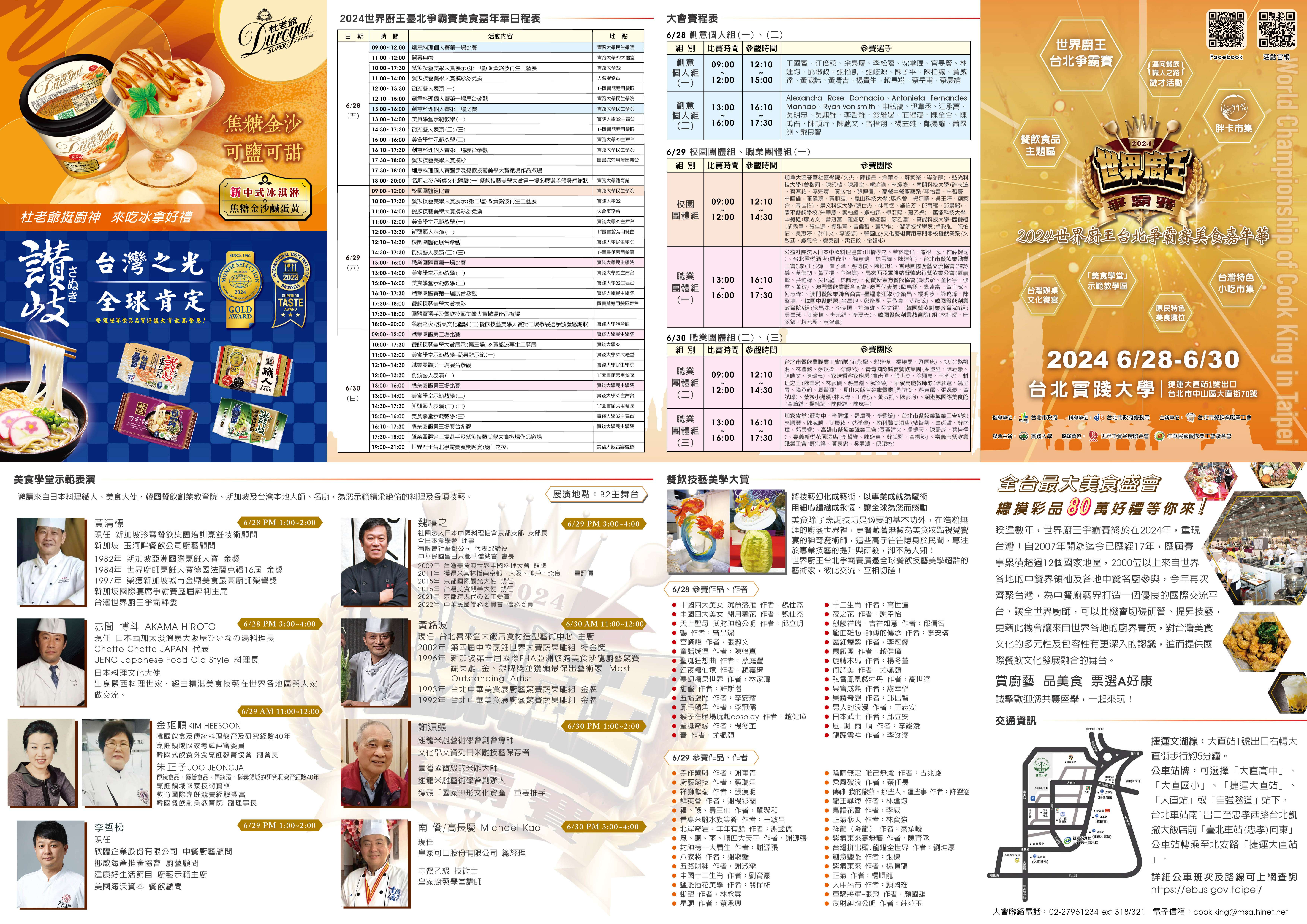 為提升勞動者職業技能拓展國際視野,臺北市餐飲業職業工會辦理「2024世界廚王爭霸賽暨美食嘉年華」,該活動訂於113年6月28日至6月30日假實踐大學辦理。