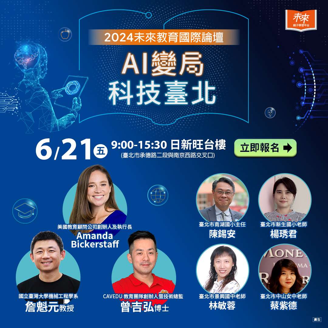 (四)報名時間及方式:有意願參與本市學校教師請於113年6月20日(星期四)前逕至「臺北市教師在職研習網」報名,上午場次北市研習字第1130613024號,下午場次北市研習字第1130613025號,或關鍵字搜尋「AI變局」;家長請於113年6月20日(星期四)前逕至表單填寫報名資料。