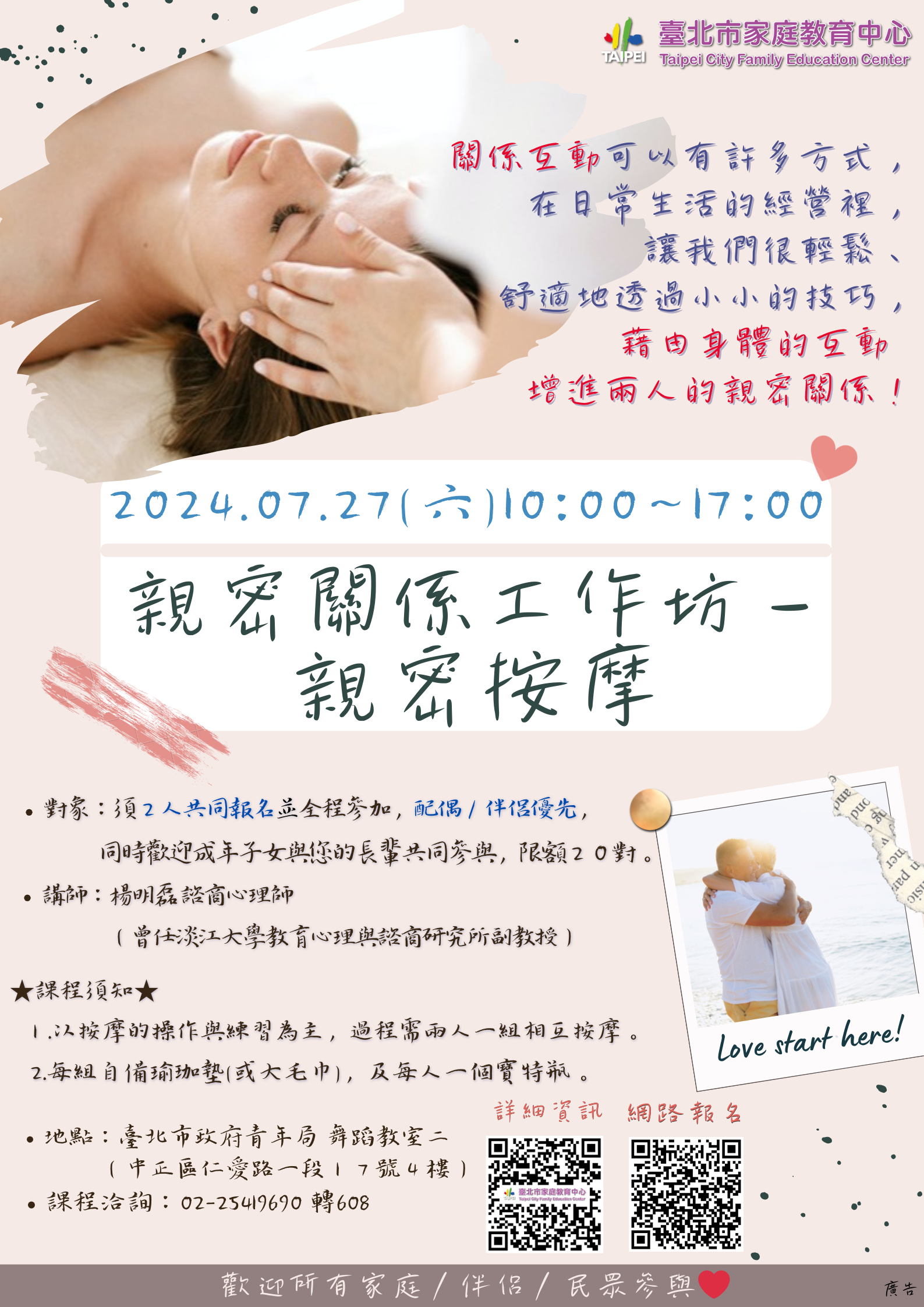 一、本課程訂於113年7月27日(星期六),藉由身體的互動輔以輕鬆、舒適的技巧,增進彼此的親密關係;對象以配偶或親密伴侶為優先,兩人全程共同參與,公務人員及本市教師可申請終身學習(研習)時數,請鼓勵所屬踴躍報名參加。