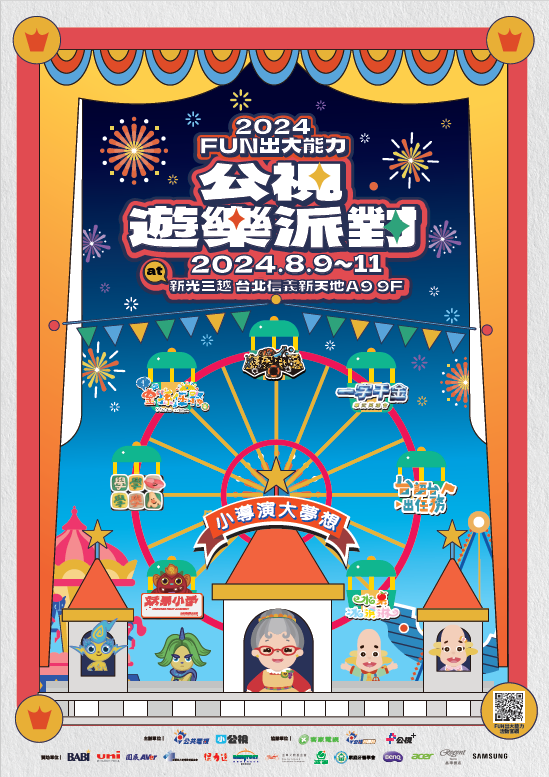 一、公視第五屆年度兒童品牌活動【FUN出大能力】公視遊樂派對,集結公視、公視台語台、客家台旗下優質兒童節目,今年更有新開台的生力軍小公視新製節目加入一起共襄盛舉。【FUN出大能力】公視遊樂派對,8月9日(五)-8月11日(日)三天,在「新光三越 台北信義新天地A9 9F」地址:台北市信義區松壽路9號9F)