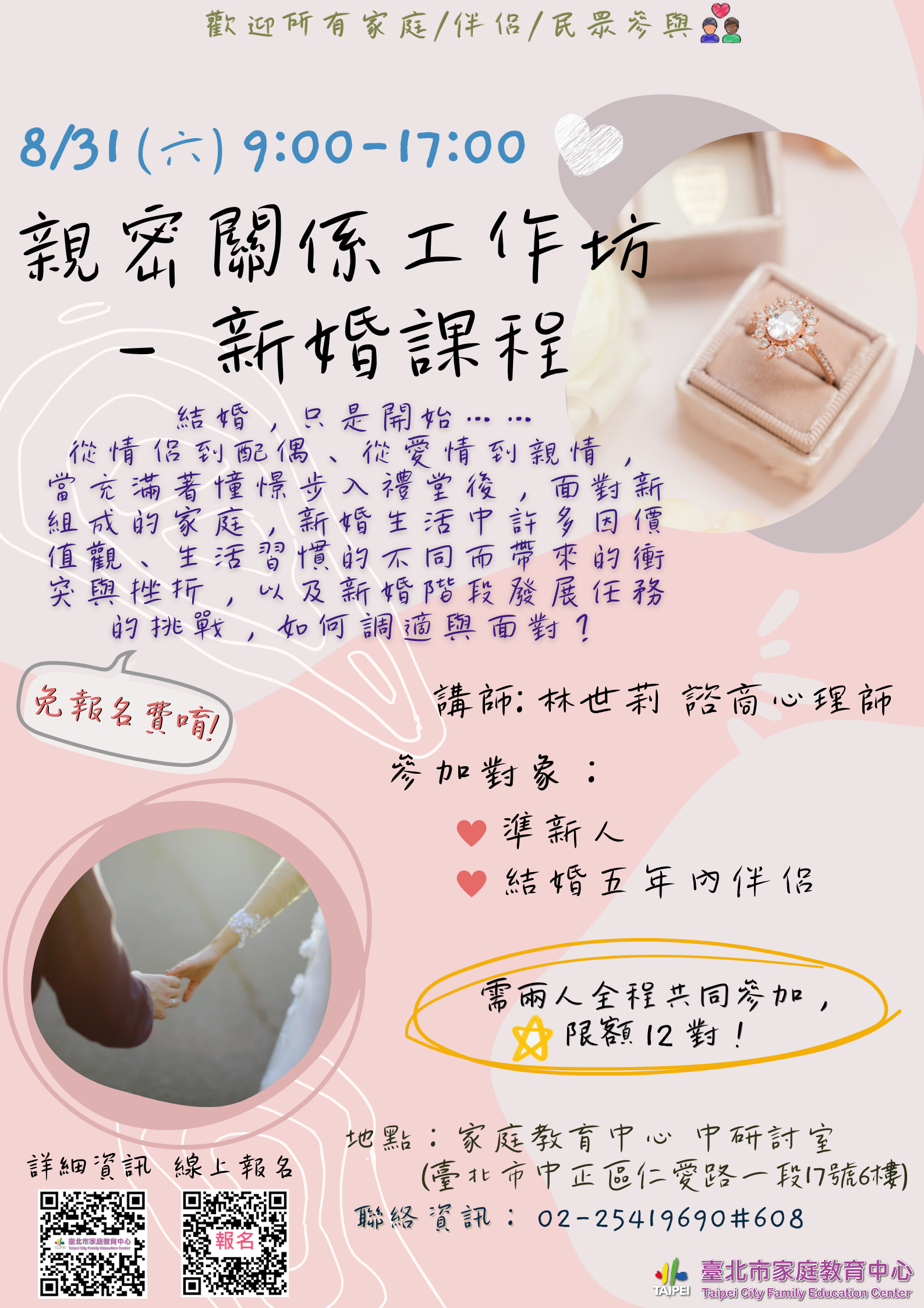 一、課程訂於113年8月31日(星期六)上午9時至下午5時,以協助「家庭新鮮人」回顧進入婚姻動機及檢視現況為題,增進學習者傾聽、溝通及經營婚姻的技巧!對象為準新人、新婚5年內伴侶,需兩人全程共同參與;公務人員及本市教師可申請終身學習(研習)時數,請鼓勵所屬踴躍報名參加。