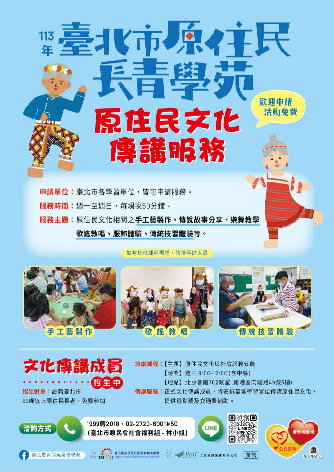一、本會為鼓勵原住民長者能貢獻其專長,參與社會服務,建立自我價值,特辦理本項服務。本會現已培訓多名原住民長者至社區、學校提供社會服務,服務內容包含原住民傳統神話故事、原住民手工藝製作教學、原住民樂舞教唱、傳統技藝學習體驗等一、本會為鼓勵原住民長者能貢獻其專長,參與社會服務,建立自我價值,特辦理本項服務。本會現已培訓多名原住民長者至社區、學校提供社會服務,服務內容包含原住民傳統神話故事、原住民手工藝製作教學、原住民樂舞教唱、傳統技藝學習體驗等各原住民族相關傳統文化內容教唱與學習等。
