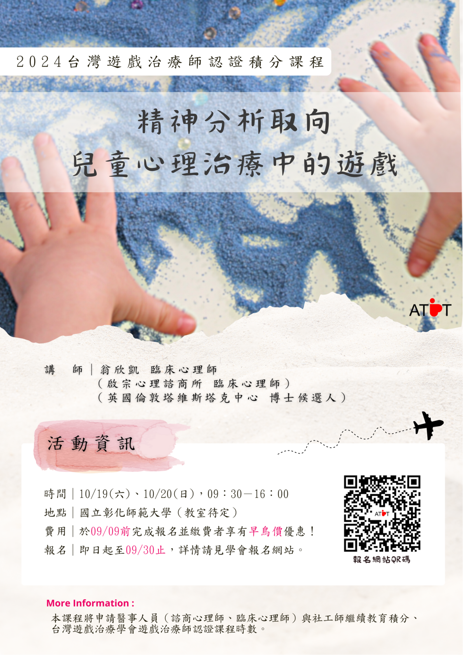 一、【2024台灣遊戲治療師認證積分課程】精神分析取向兒童心理治療中的遊戲,課程時間及講師資訊。