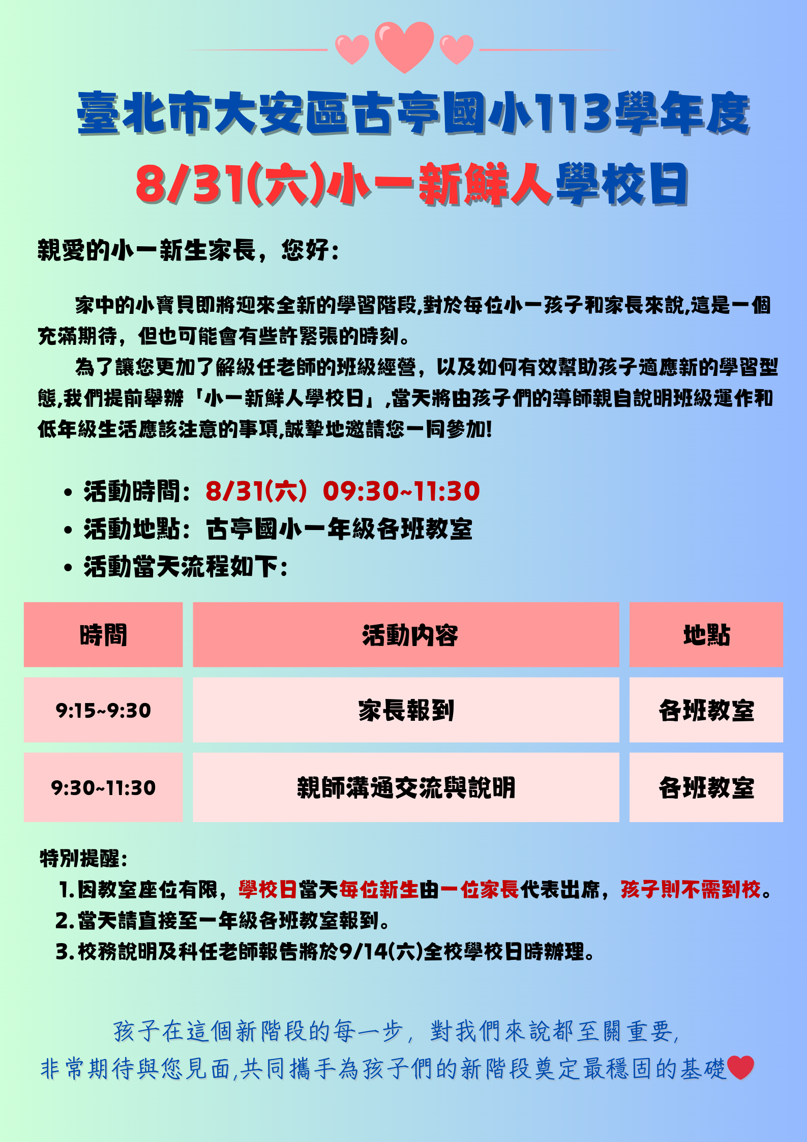★其餘二至六年級、校務說明、科任老師報告皆安排在9/14(六)全校學校日時辦理。
