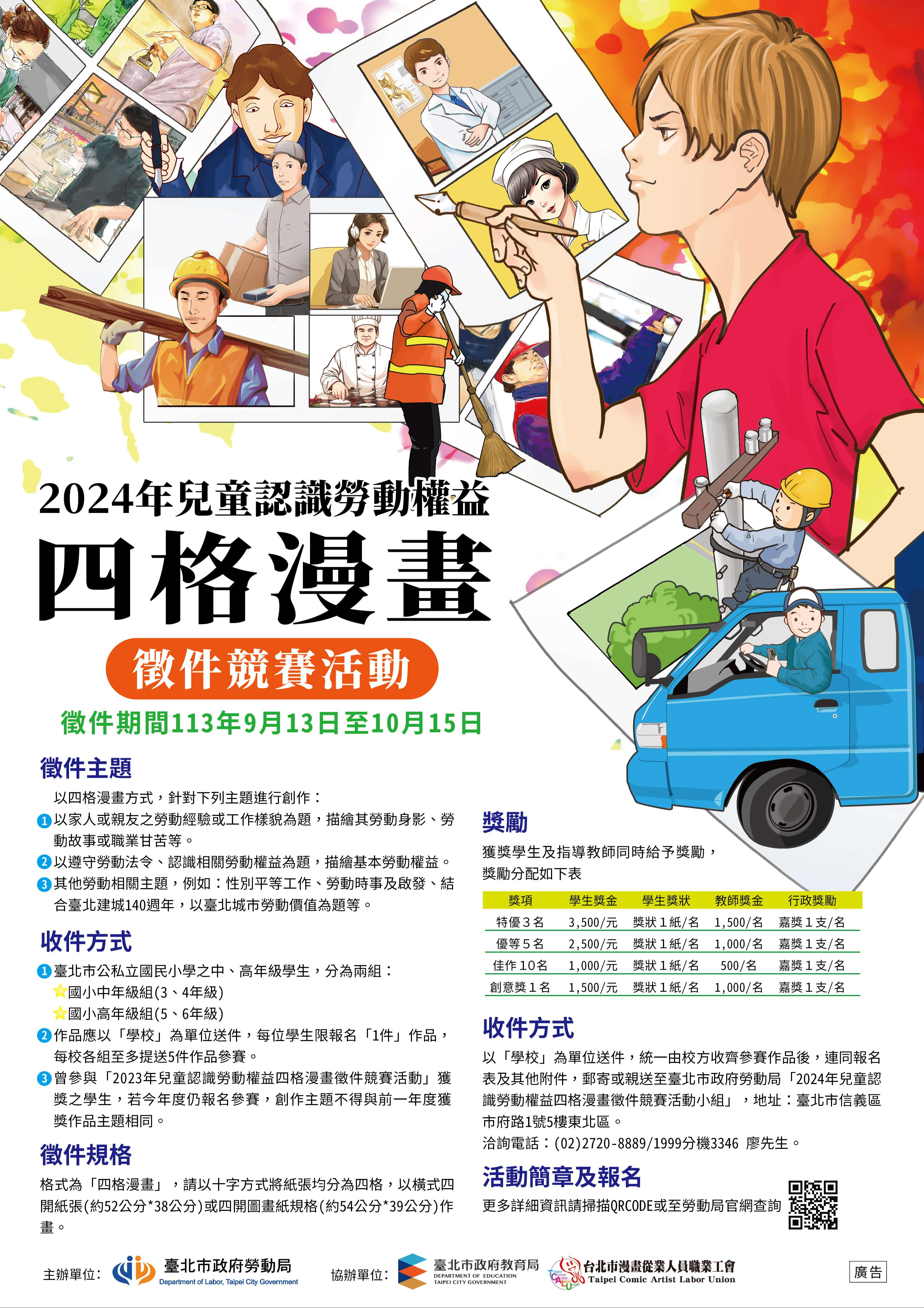 三、詳細競賽內容及送件方式請參閱活動簡章(如附件2),亦可至本局官網瀏覽及下載(路徑:臺北市政府勞動局/業務服務/勞動教育文化/勞動教育/兒童認識勞動權益四格漫畫徵件競賽活動),如有相關疑問,請洽活動專線:(02)2720-8889/1999轉分機3346廖先生。