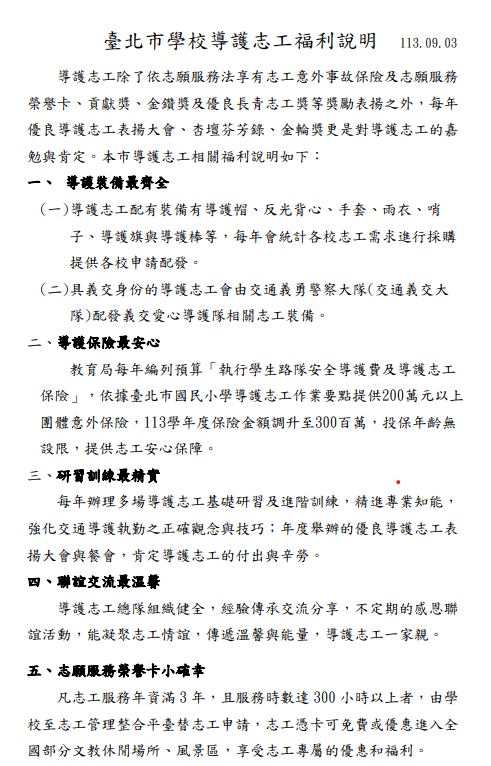二、為能廣泛運用社會資源,鼓勵家長、社區民眾或社會愛心人士協助學校執行導護工作,以維護學生上放學安全,本局前以112年8月1日北市教國字第1123071680號函發導護志工招募試辦計畫。茲彙整導護志工福利說明(附件1),以 利各校公告周知,廣邀各界人士加入導護行列。