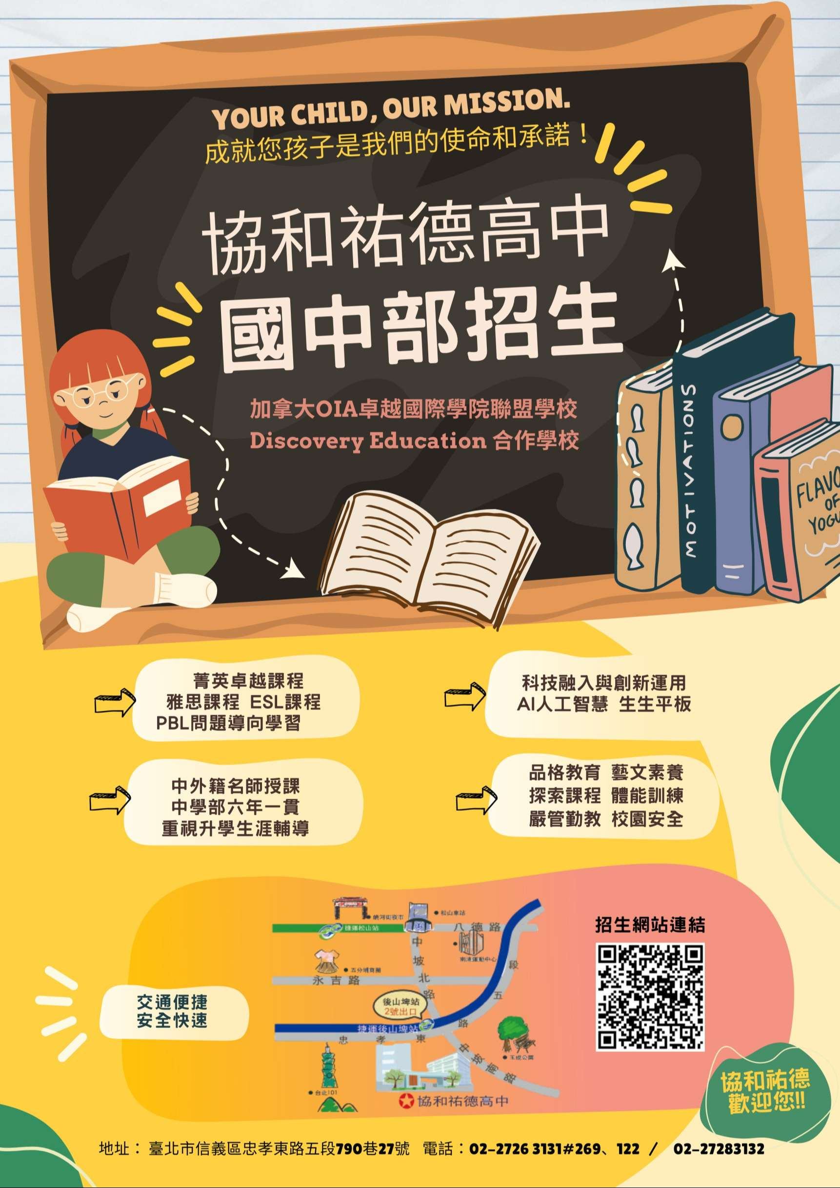一、祐德高中國中部為家有四五六年級生之家長辦理多場招生說明會, 詳細說明招收國中部之教育理念、辦學願景及課程特色… 等,歡迎關心孩子教育的家長踴躍報名。