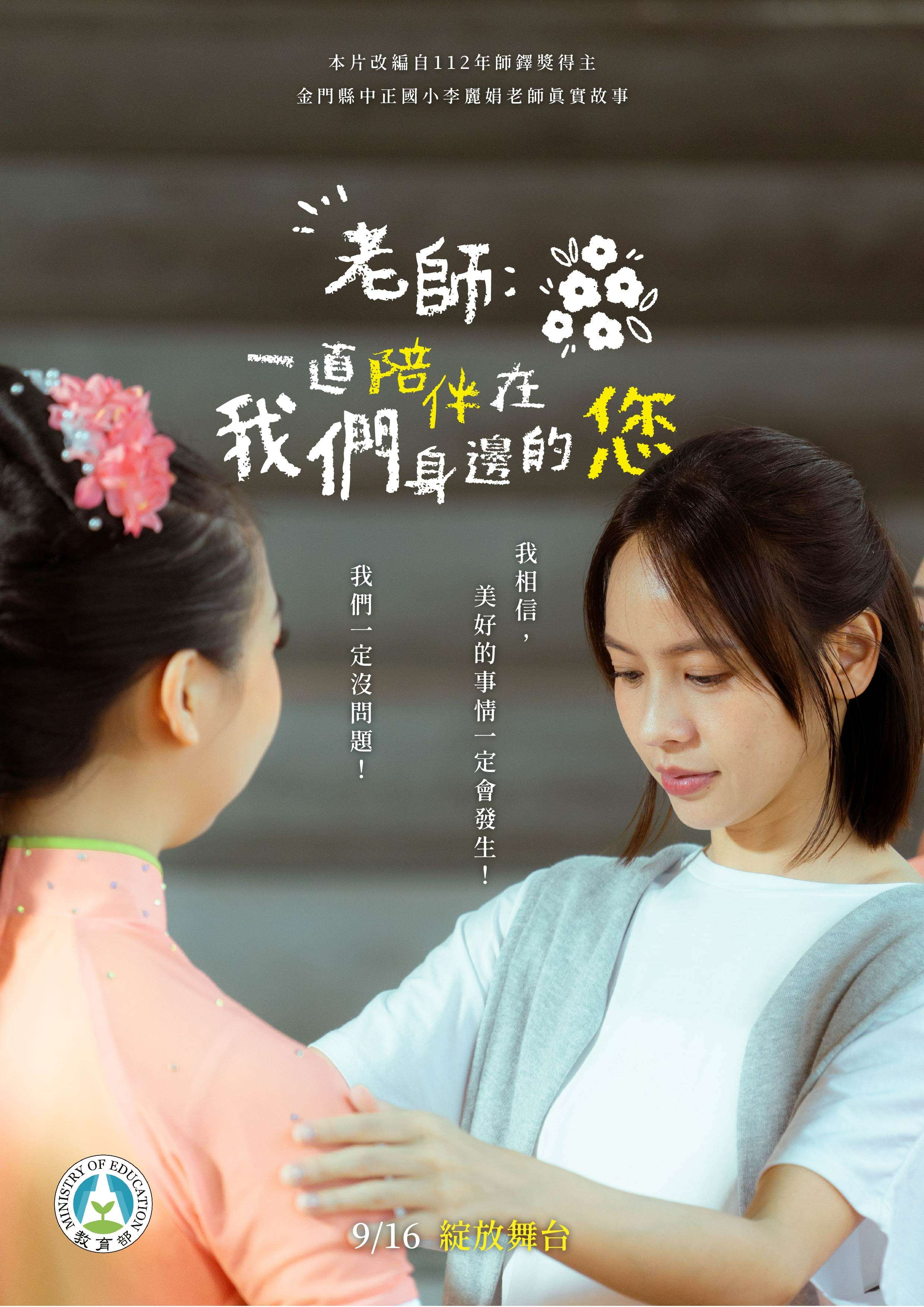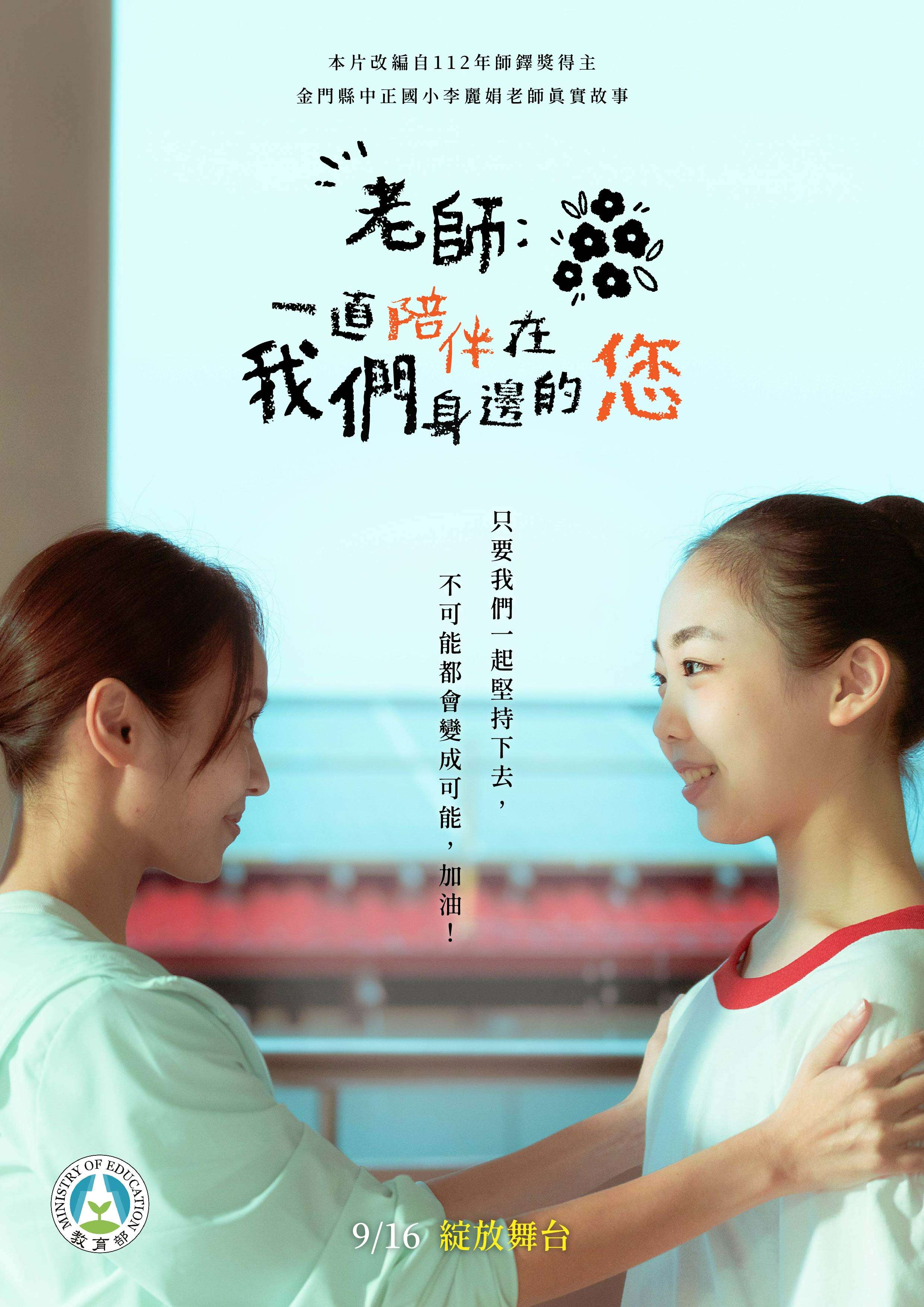 一、本片改編自師鐸獎得主金門縣中正國小李麗娟老師的經歷,透過教師與學生共同努力、成長之過程,展現教育及陪伴,帶來的改變與力量;本片由知名演員黃姵嘉領銜主演,藉由她與學生的真情演繹,傳遞了「是老師,讓不可能成為可能」的核心訊息,期許觀眾能感受到老師無條件的默默付出,體會老師的辛勞,進而向師長們表達最真摯的感謝。