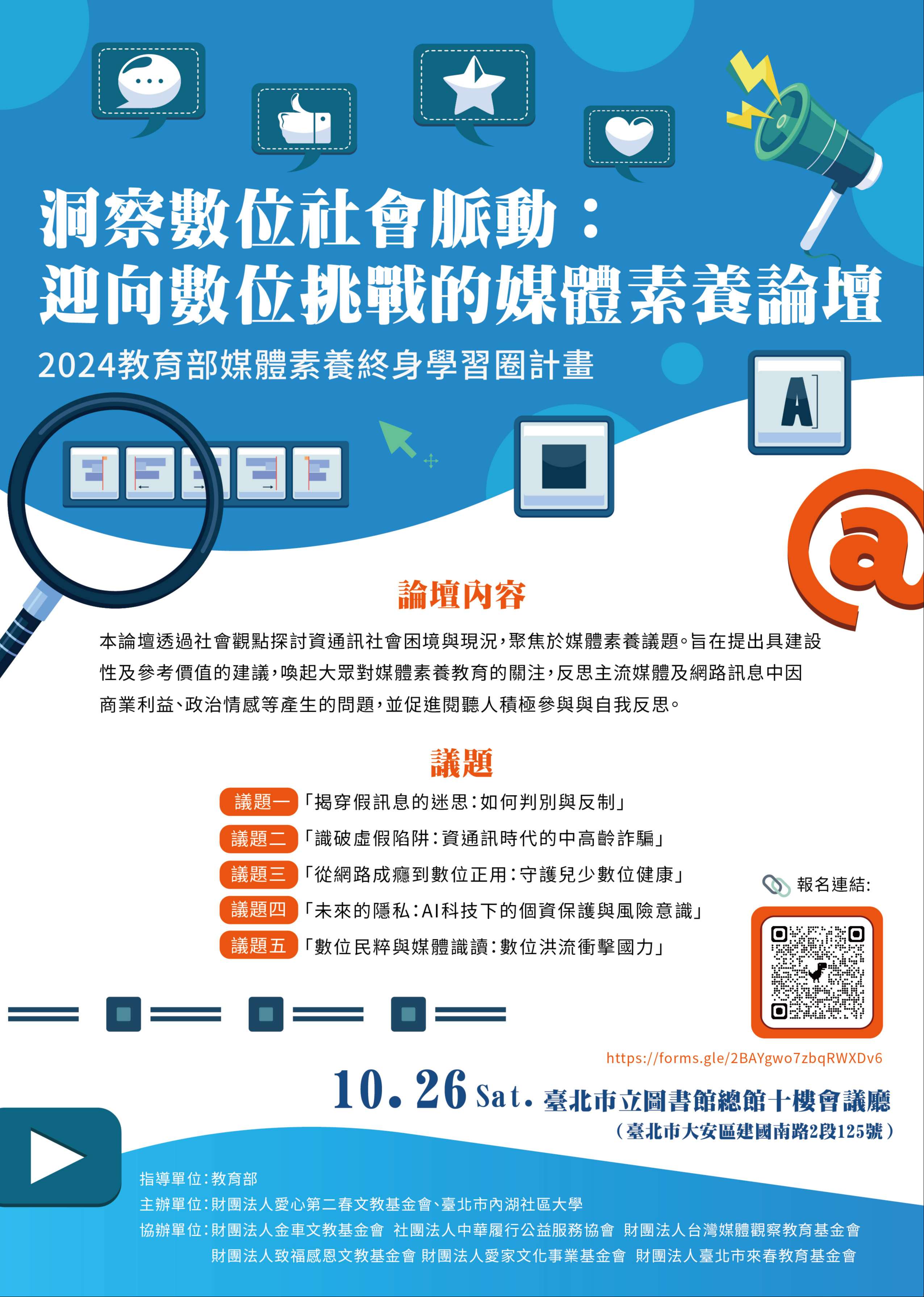 一、本論壇旨在提出具建設性及參考價值的建議,喚起大眾對媒體素養教育的關注,反思主流媒體及網路訊息中因商業利益、政治情感等產生的問題,並促進閱聽人積極參與與自我反思。