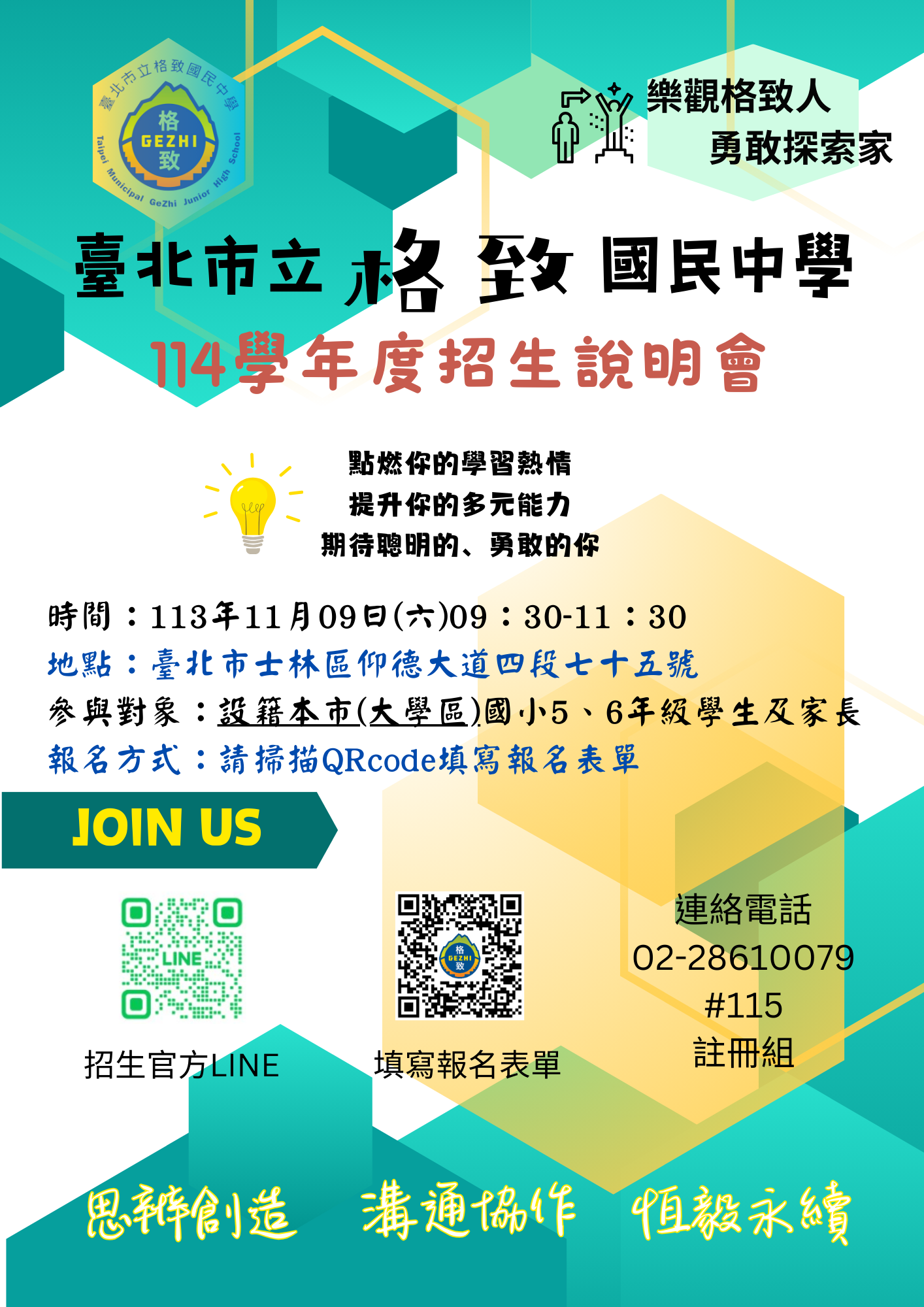 一、格致國中為臺北市第一所公立雙語實驗課程國中,以全人發展的教育理念為核心,以思辨創造、溝通協作、恆毅永續為辦學主軸,並繼續研發且實施雙語課程及陽明山校本課程,期望能提升學生學習表現,讓孩子天賦自由,培養其潛能,塑造美善人格,創造亮麗的未來人生。