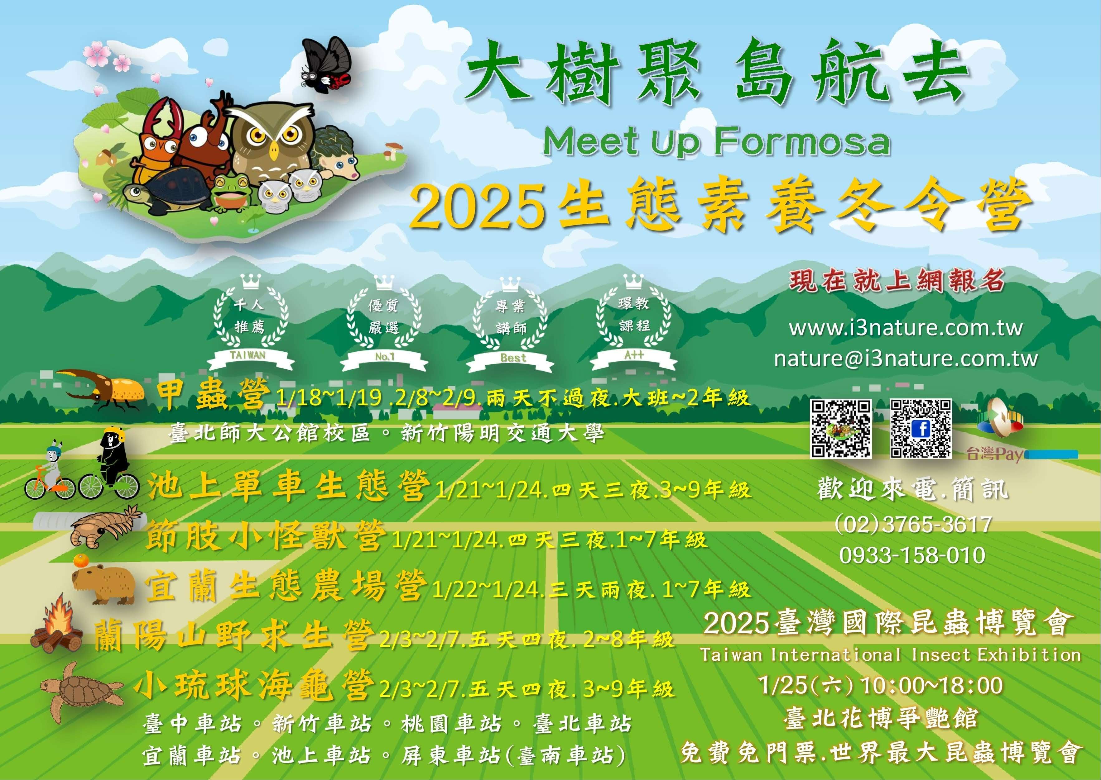 愛上大自然文教將於114年寒假辦理【大樹聚島航去】2025生態素養冬令營共七個梯次,暨參展2025第六屆臺灣國際昆蟲博覽會活動。