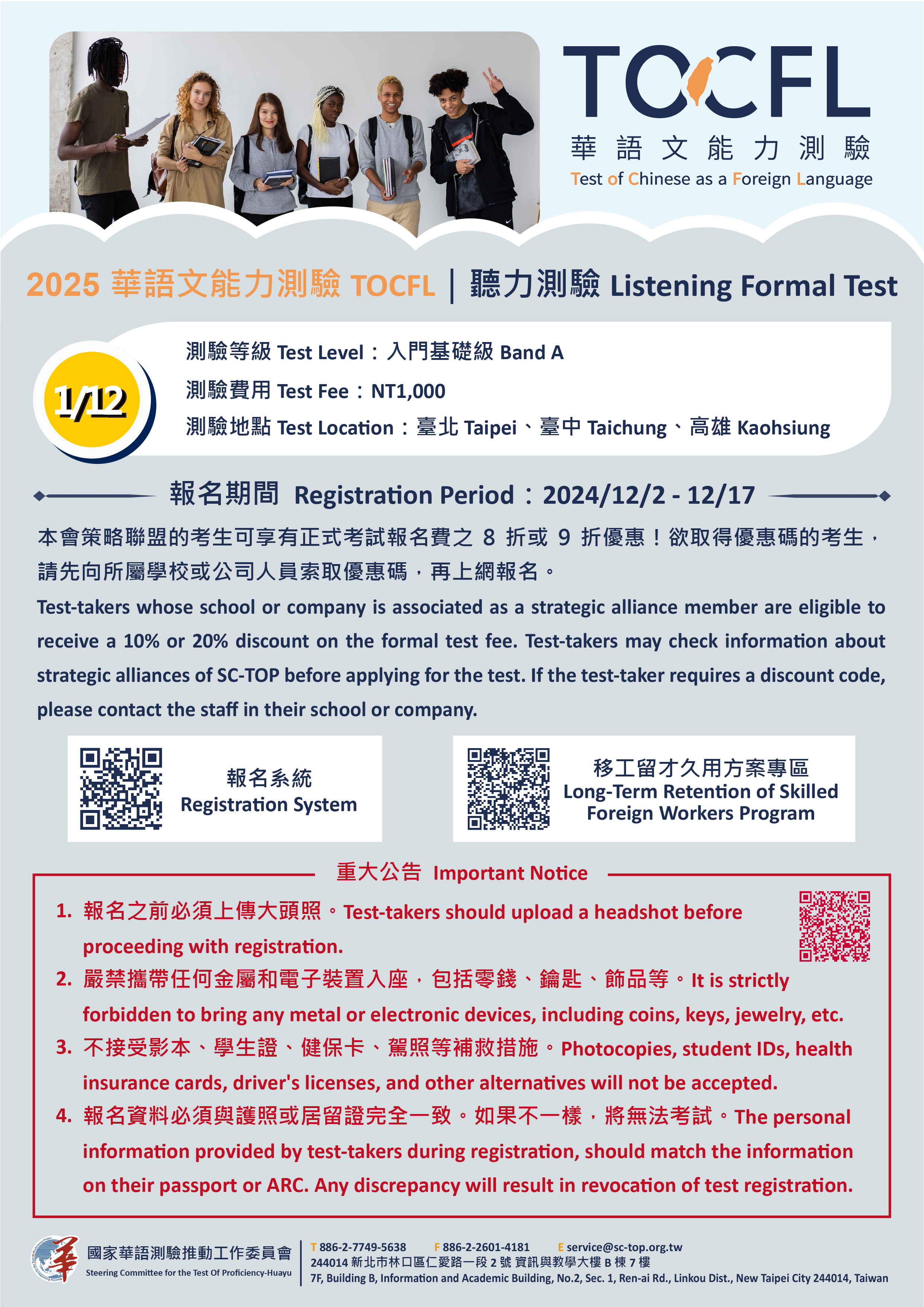 (二)114年1月12日(星期日):聽讀測驗—電腦化適性測驗、聽力測驗入門基礎級(移工留才久用方案)。
