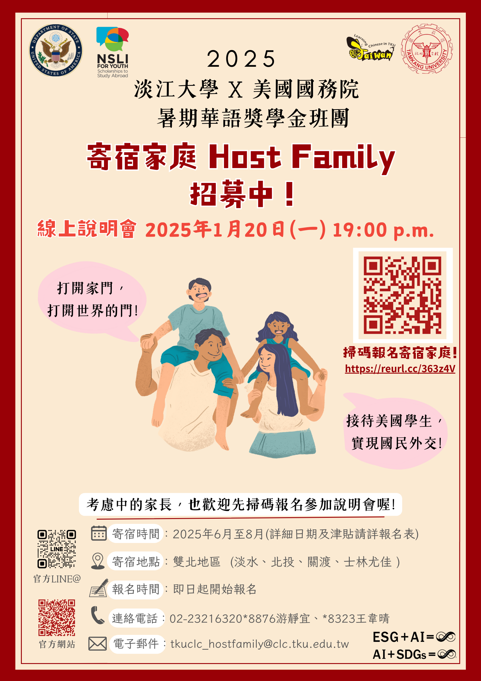 五、寄宿家庭及線上說明會(114年1月20日晚上7時)報名網址,考慮中的家庭可先聆聽線上說明會再決定是否報名;有意願提供寄宿空間之家庭需先行至報名網址填寫資料,承辦人員將審核家庭資料並安排實地走訪接待住宿地點,再另行通知錄取及備取名單。