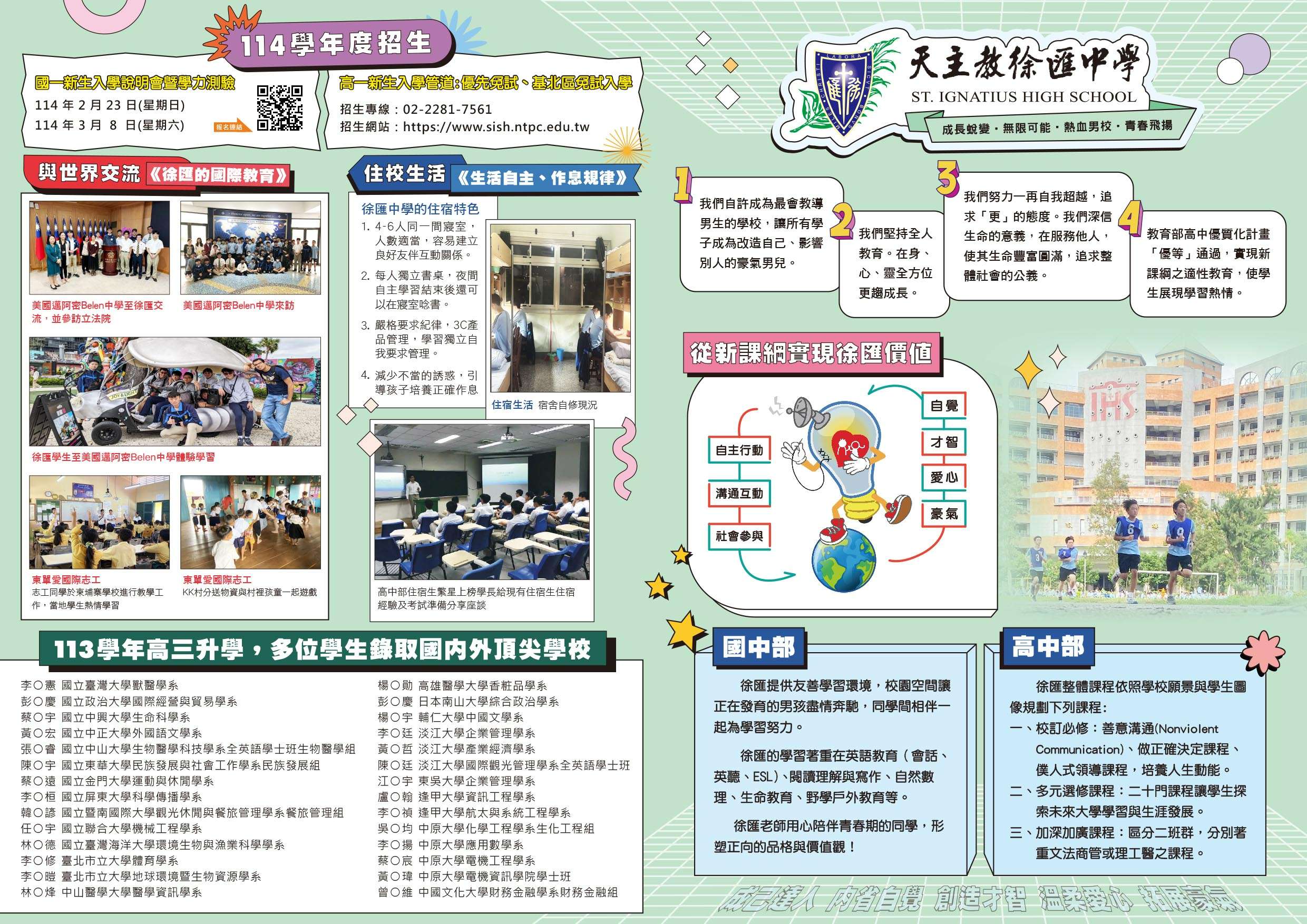 一、徐匯中學著重培育學生具備自覺、才智、愛心、豪氣四大能力,歡迎六年級男生及家長參加本校辦理之新生說明會。
