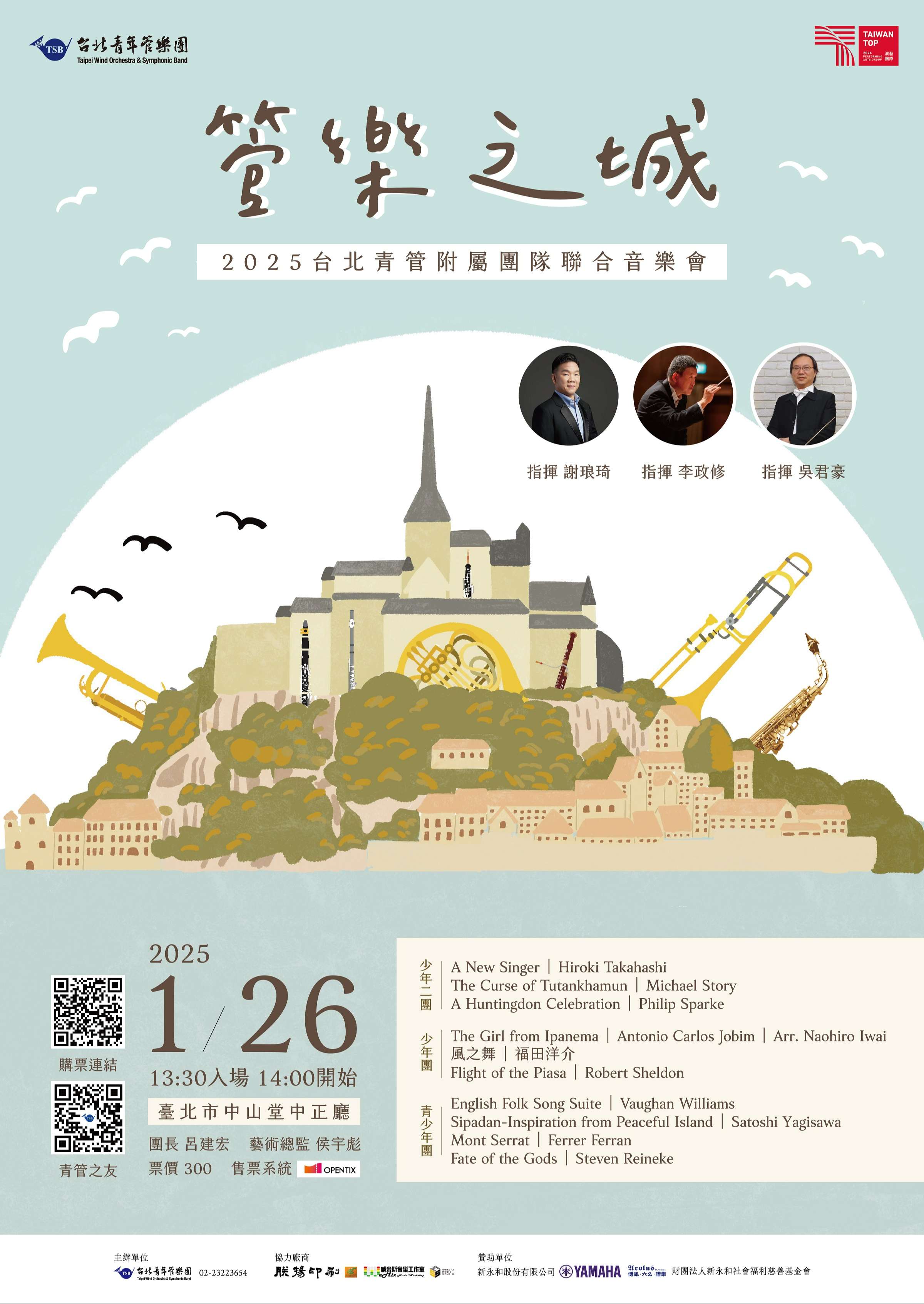 一、2025台北青管附屬團隊聯合音樂會,由謝琅琦、李政修與吳君豪3位老師,指揮台北青管附屬團隊演出,帶來一連串耳熟能詳的管樂經典曲目。 二、旨揭音樂會相關訊息如下: (一)演出時間:114年1月26日 (星期日)下午2點。 (二)演出地點:臺北市中山堂中正廳(臺北市中正區延平南路98號)。 (三)購票與折扣優惠查詢請至OPENTIX售票系統;相關問題請逕洽台北青管樂團經理王先生(02-2322-3654)。 (四)相關音樂會資訊請至台北青年管樂團臉書粉絲專頁查詢。 三、檢附音樂會海報供參。
