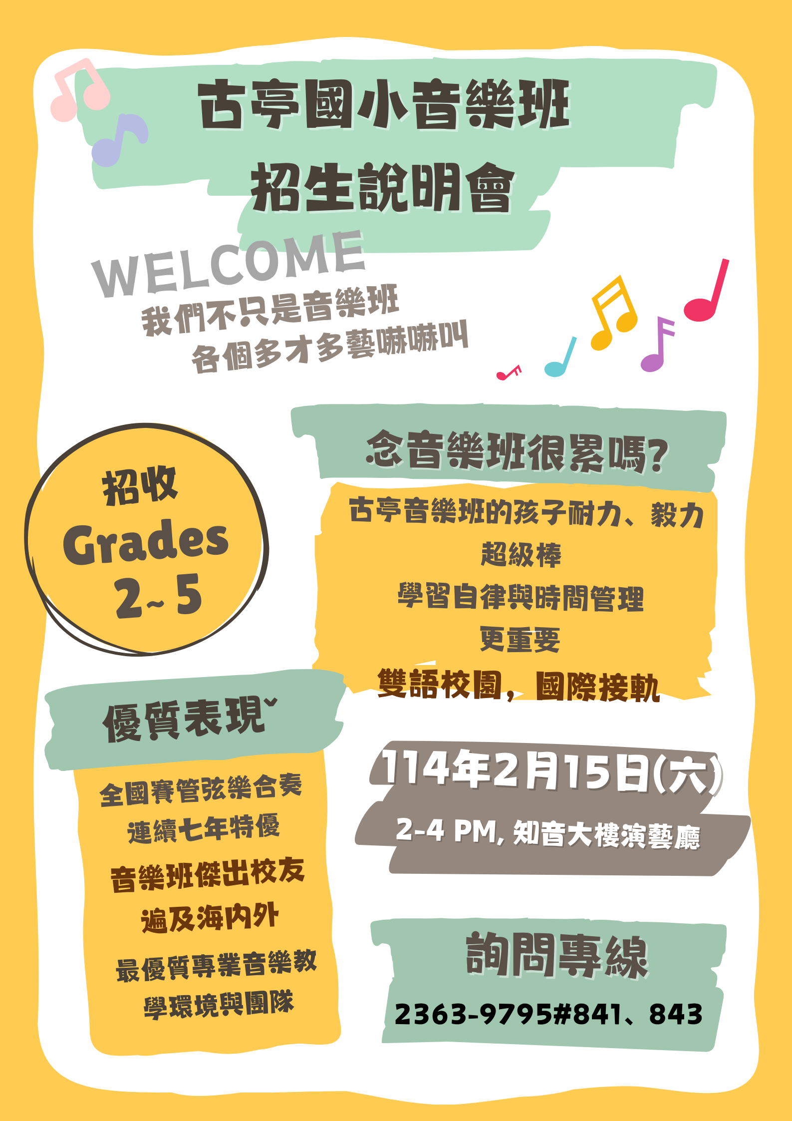 為讓更多認同音樂教育及喜愛喜歡的家長與學生,能認識古亭音樂班的課程特色與環境,我們攜手本校音樂班的優秀學生,特於114年2月15日下午2:00~4:00辦理招生說明會及展演,歡迎各校對音樂教育有興趣的的家長及學生,踴躍參與此項活動!