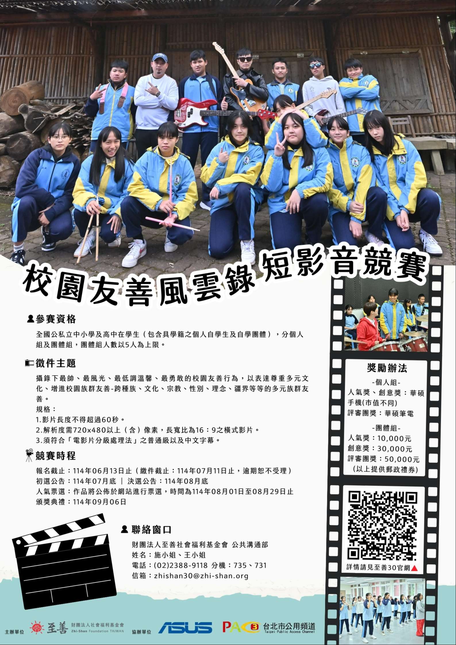 二、該基金會(官網)長期從事 亞洲4地兒少發展工作,為響應「兒童權利公約」(CRC) 中禁止歧視原則,自2023年起倡議「校園族群友善」,已 連續兩年舉辦校園族群友善獎。該會將辦理「校園友善風雲錄-短影音競賽」,邀請全國國小至高中學生共同參與,促進校園友善。