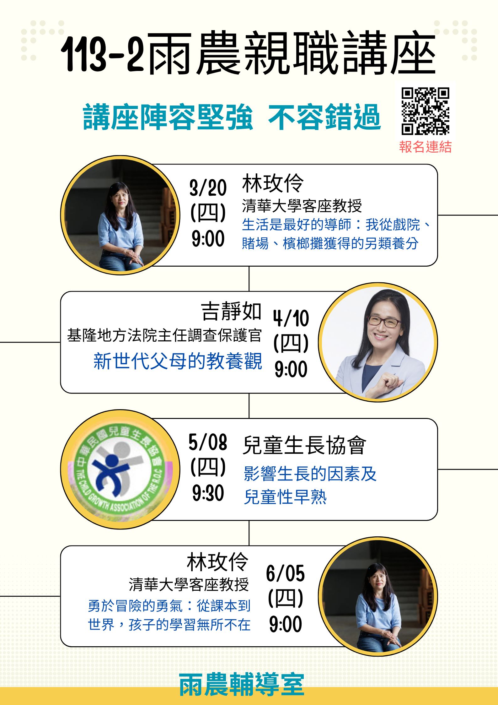 一、雨農國小3至6月共計辦理四場親職講座課程,結合愛的存款簿學習集點活動給予時數,地點在本校活動中心一樓視聽教室。講座課程內容如下: