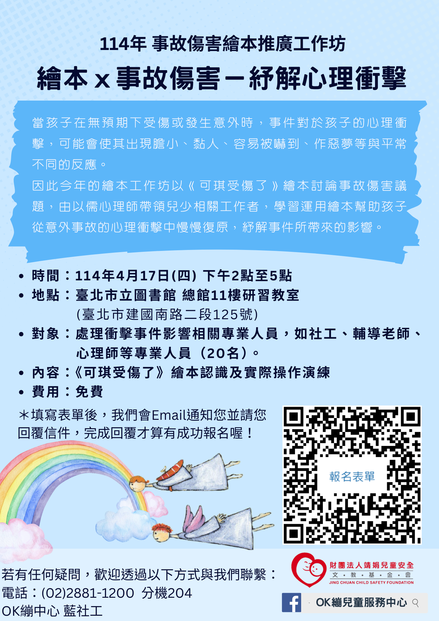 四、檢附「114年事故傷害繪本推廣工作坊《繪本x事故傷害— 紓解心理衝擊》」宣傳單1份。