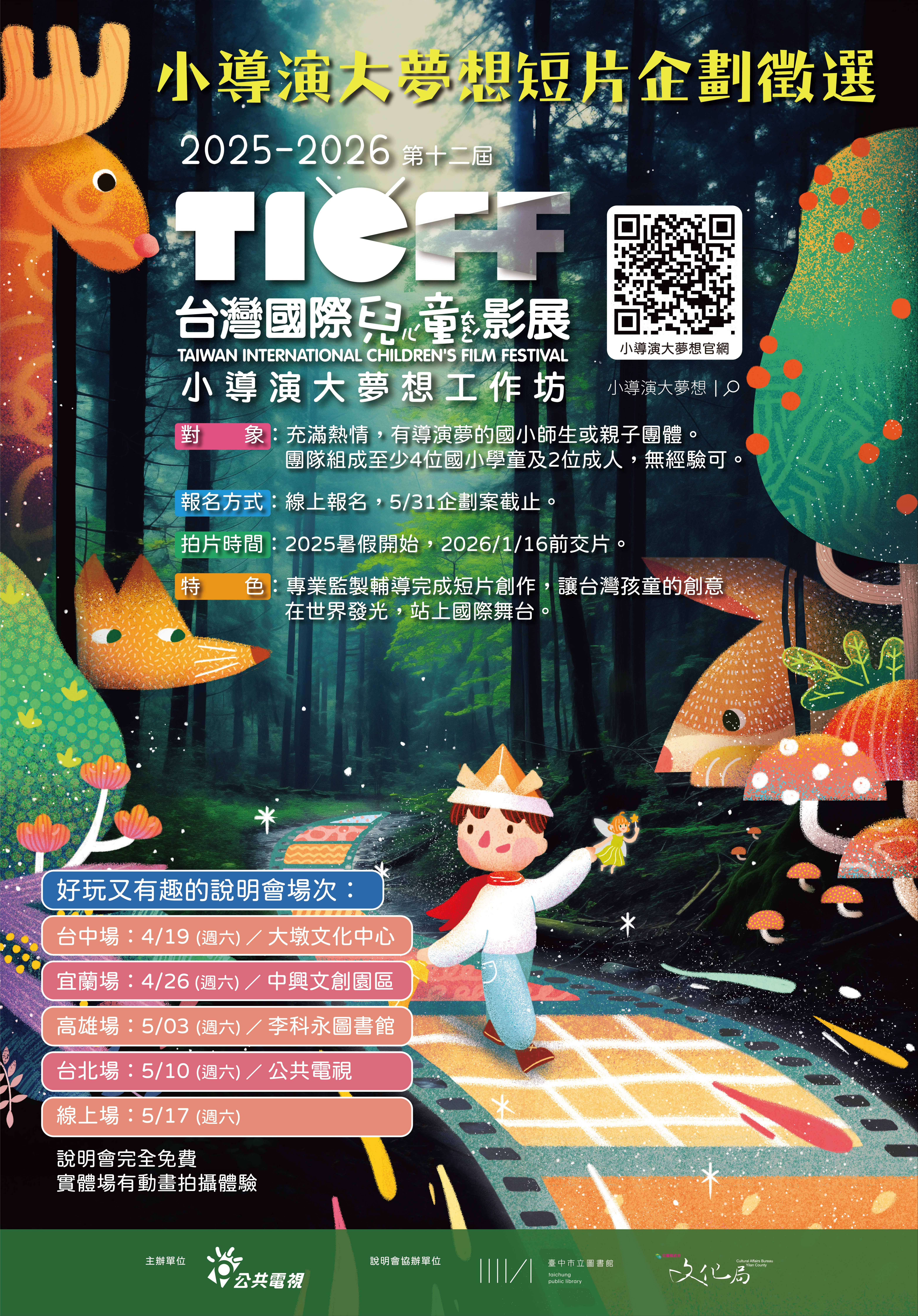 三、「兒童短片企劃案徵選」於2025/5/31截止收件,歡迎國小師生、親子團隊組隊上網報名。提出拍片企劃參加徵選,入選團隊可享整套拍片輔導資源,完成短片擇優送國際參展。相關活動細節請上活動官網 。