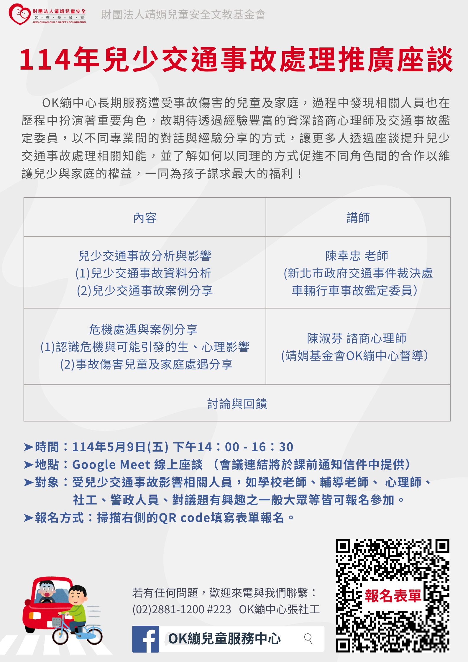 二、靖娟基金會OK繃兒童服務中心於114年5月9日14時至16時30分,採線上方式辦理「兒少交通事故處理推廣座談」,期待透過對話方式從交通、心理、社會等角度分享中心協助處理交通事故的服務經驗傳達給更多相關工作者,讓不同專業之間以同理的態度更了解彼此,一同協助為孩子謀取最大的利益。