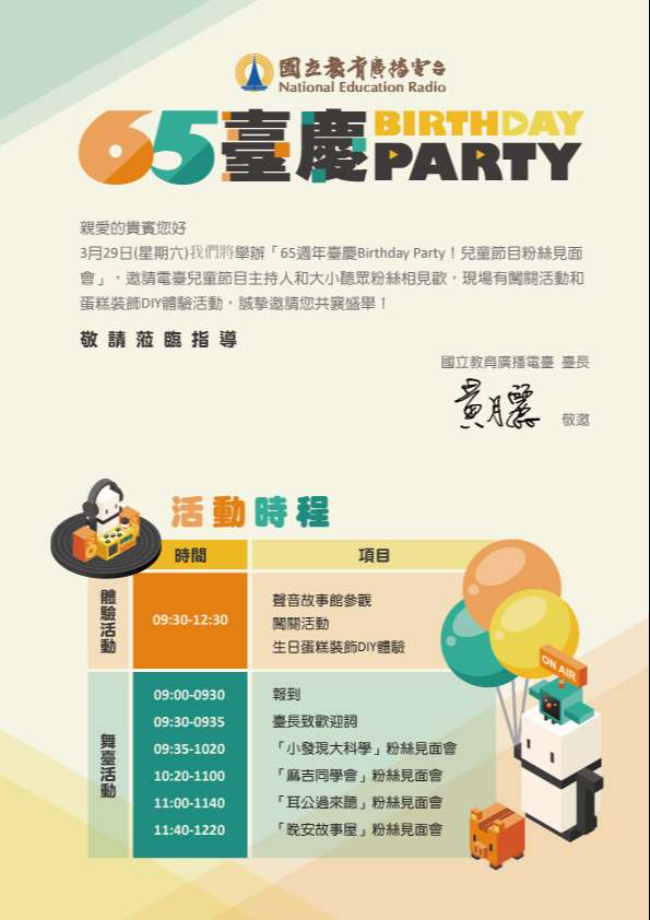 一、旨揭活動以「聲音的饗宴」為主題,邀請深受聽眾歡迎的四個兒童節目舉辦粉絲見面會,現場有闖關活動、聲音故事館參觀和體驗活動等,本活動為自由報名參加,活動詳情可至官網查詢